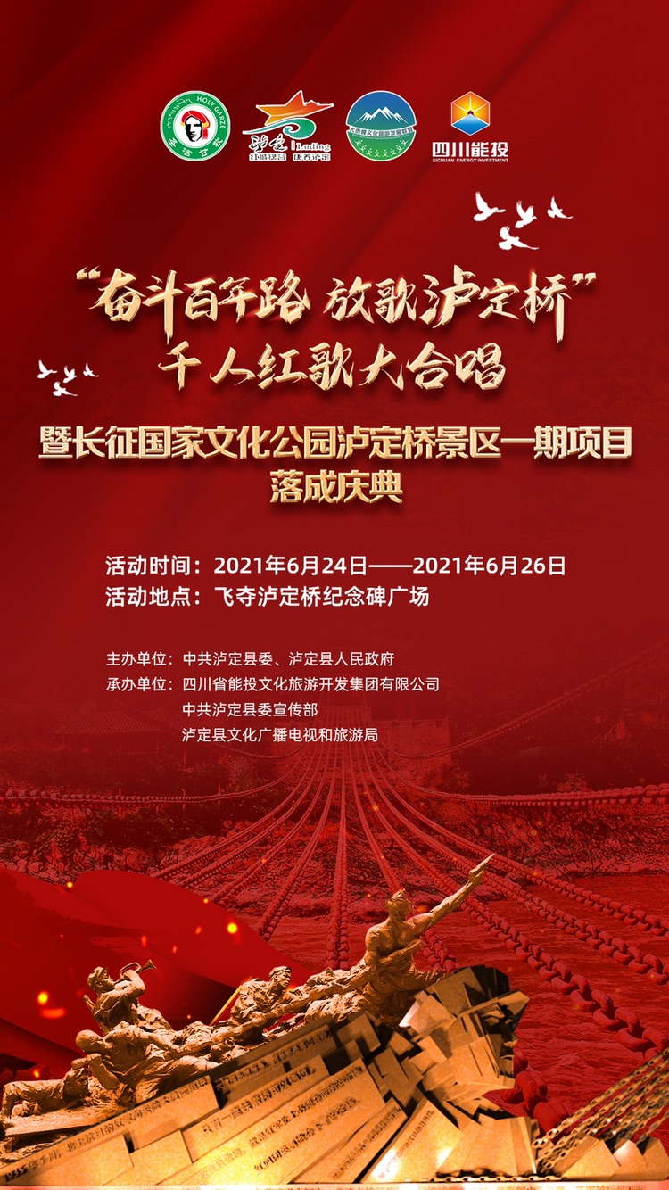 四川发布客户端消息 漫漫征途忆峥嵘岁月,声声嘹亮颂百年初心。为庆祝建党100周年,讴歌党的光辉历程,缅怀党的丰功伟绩,激励泸定人民传承红色基因,赓续精神血脉,深化党史学习教育,共同唱响共产党好、社会主义好、改革开放好、伟大祖国好的时代旋律。由中共泸定县委、泸定县人民政府主办,四川省能投文化旅游开发集团有限公司、中共泸定县委宣传部和泸定县文广旅局承办的“奋斗百年路,放歌泸定桥”千人红歌大合唱暨长征国家文化公园泸定桥一期工程落成庆典将于本月24日至26日举行。