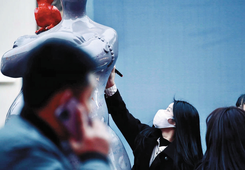 在井巷子小洋楼广场,它们有的正举着望远镜眺望、有的步履匆匆、有的正抱臂沉思、有的悠闲地坐在街边张望、有的运动打球……除了观赏外,这组“现代说唱俑”还能互动──游客还可以用不同颜色的笔在雕塑指定区域留下2022个心愿!记者了解到,雕塑表面的透明清漆固化保护,可以永久存留所有笔迹。(记者 孔维睿 卢星宇 文/图)