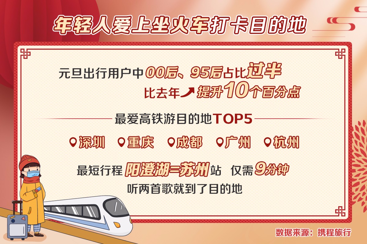 携程发布的《2022元旦假期出行数据报告》显示,新的一年,许多强调“迎新”仪式感的年轻用户选择在旅途中开启新的人生旅程。在今年元旦出行的人群中,00后和95后用户占比过半,比去年同期提升逾10个百分点,这批年轻群体在携程平台预订最多的产品为火车票,他们最爱的高铁游目的地TOP5为深圳、重庆、成都、广州和杭州。年轻用户规模的扩大也对国内热门出行目的地有所影响,不少具备活力感标签的“网红”新一线城市表现出强劲吸引力,近三成出行用户选择到新一线城市游玩。数据显示,元旦全国十大周边热门目的地排行中,南京、成都、杭州、郑州、长沙等新一线城市占据半数席位。