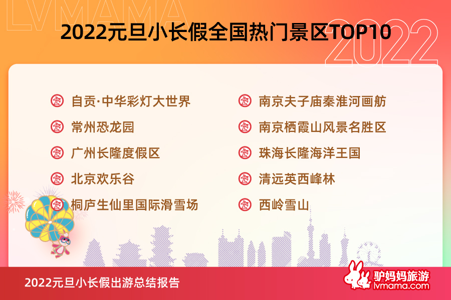 驴妈妈发布的《2022元旦小长假出游总结报告》则重点关注了元旦假期短途冰雪游的火爆,其中成都周边的西岭雪山、瓦屋山、毕棚沟等景区都迎来了客流高峰,西岭雪山景区还进入全国热门景区TOP10。《报告》还显示,元旦假期还有许多上班族借着最后“清零”年假的机会,通过旅行为2021年画下圆满句号,成都也成为今年元旦小长假最受欢迎的国内游目的地之一,预订客群则以2-3人出游为主,情侣同行、闺蜜同游较为普遍。此外,自贡.中华彩灯大世界、西岭雪山、成都欢乐谷、成都融创文旅城、瓦屋山、毕棚沟、达古冰川占据了西南地区人气景区TOP10的其中七席。