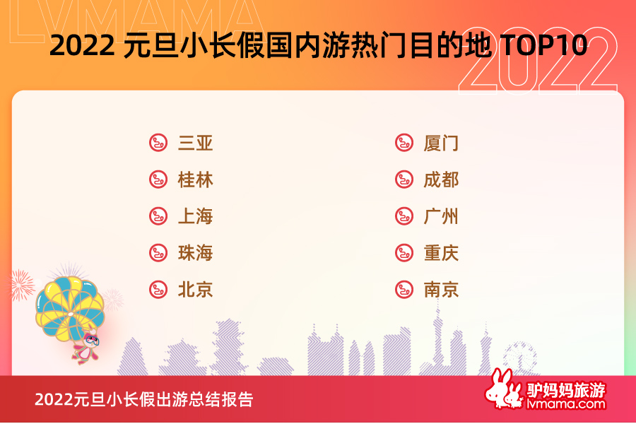 同程旅行发布《2022元旦假期旅行消费数据报告》则显示,元旦期间出游热度最高的5个省份分别为广东、四川、海南、江西和广西。受局部疫情影响,部分传统旅游大省元旦旅游市场受挫,而疫情影响较小的南方省市出游热度更高,80后仍是出游占比最高的人群,占比为38%。元旦假期酒店预订热门目的地分别为深圳、南昌、广州、成都、上海、南宁、长沙、重庆、三亚和北京。国内机票热门出发城市分别为上海、成都、北京、广州、重庆、深圳、郑州、杭州、武汉和贵阳。火车票方面,重庆和成都之间的往返线路登上热门榜单。