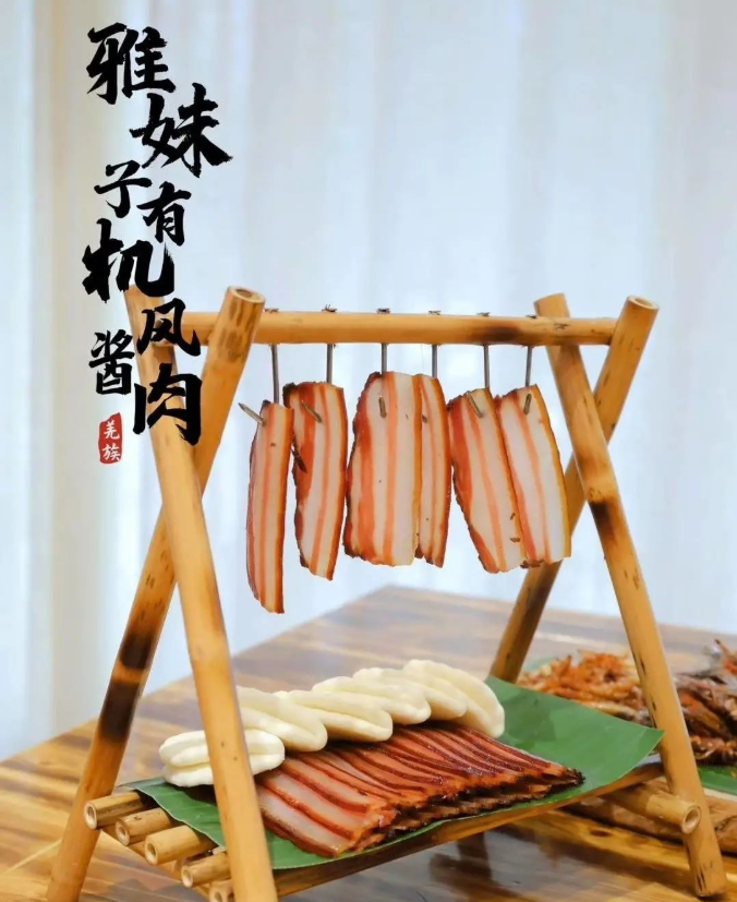 雅妹子风酱肉,起源于洪雅县瓦屋山区,是洪雅民间传统手工制作肉食品的代表。切成薄片晶莹剔透,光是看着就让人垂涎欲滴。