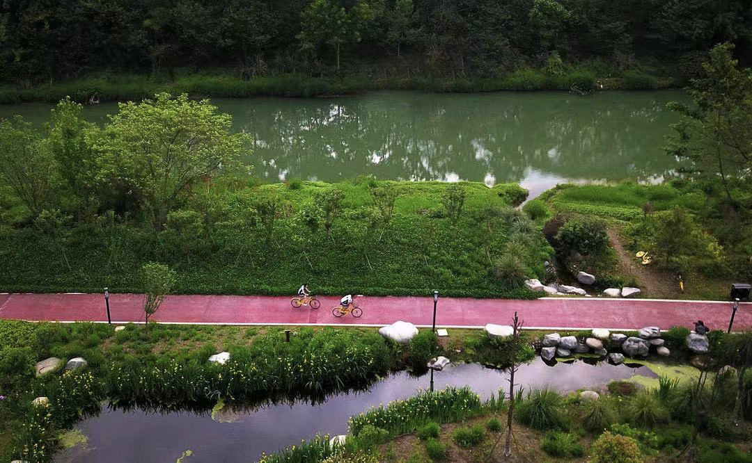 绿道两岸引水入园,形成上千亩的林下湿地,城市海绵净化水质,保留了数千棵乔木及众多竹林、花灌、沟渠、田塘等。
