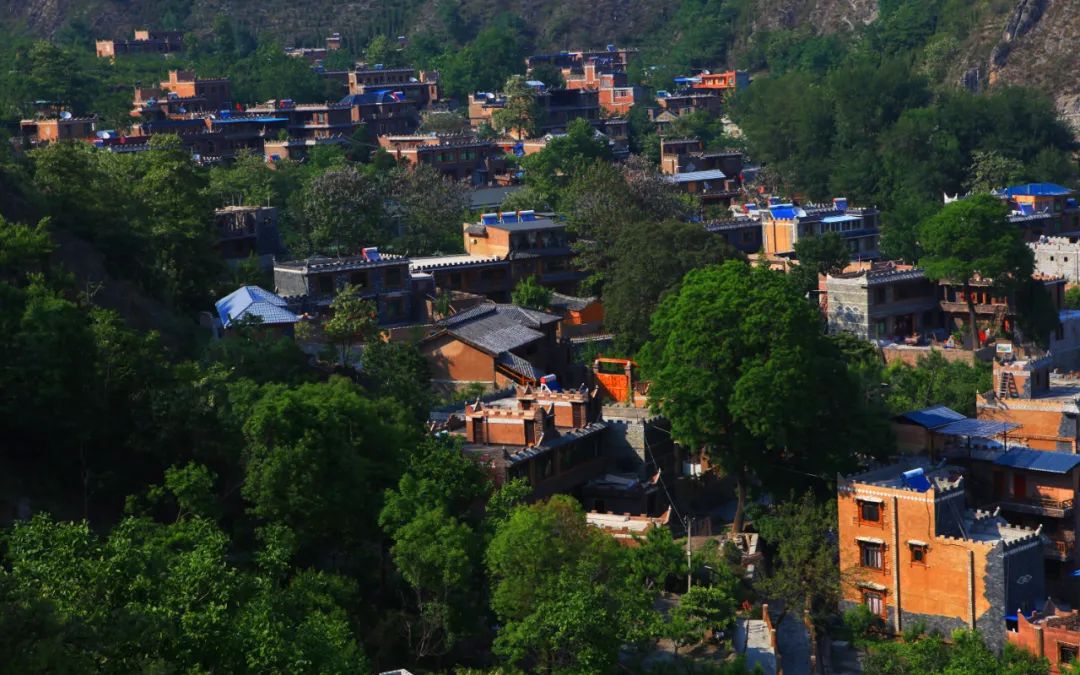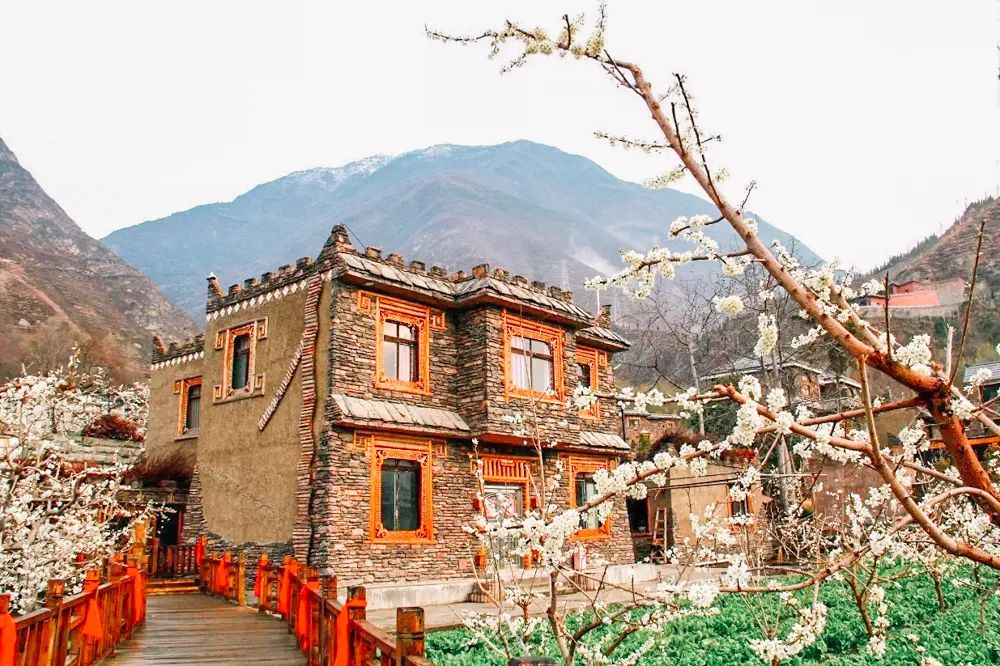 大片的绿荫簇拥着古朴恢宏的羌族民居,羊角演化而来的屋檐,印着羊头图案的窗户,以及“众皆依山居止,累石为室”的传统建筑风格,极具羌族民居特色。