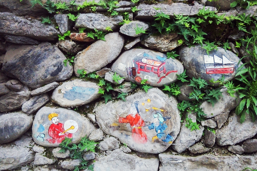 坪头羌寨的释比文化长廊就是释比文化的体现,廊道两侧的石墙上画有五颜六色的释比图案。