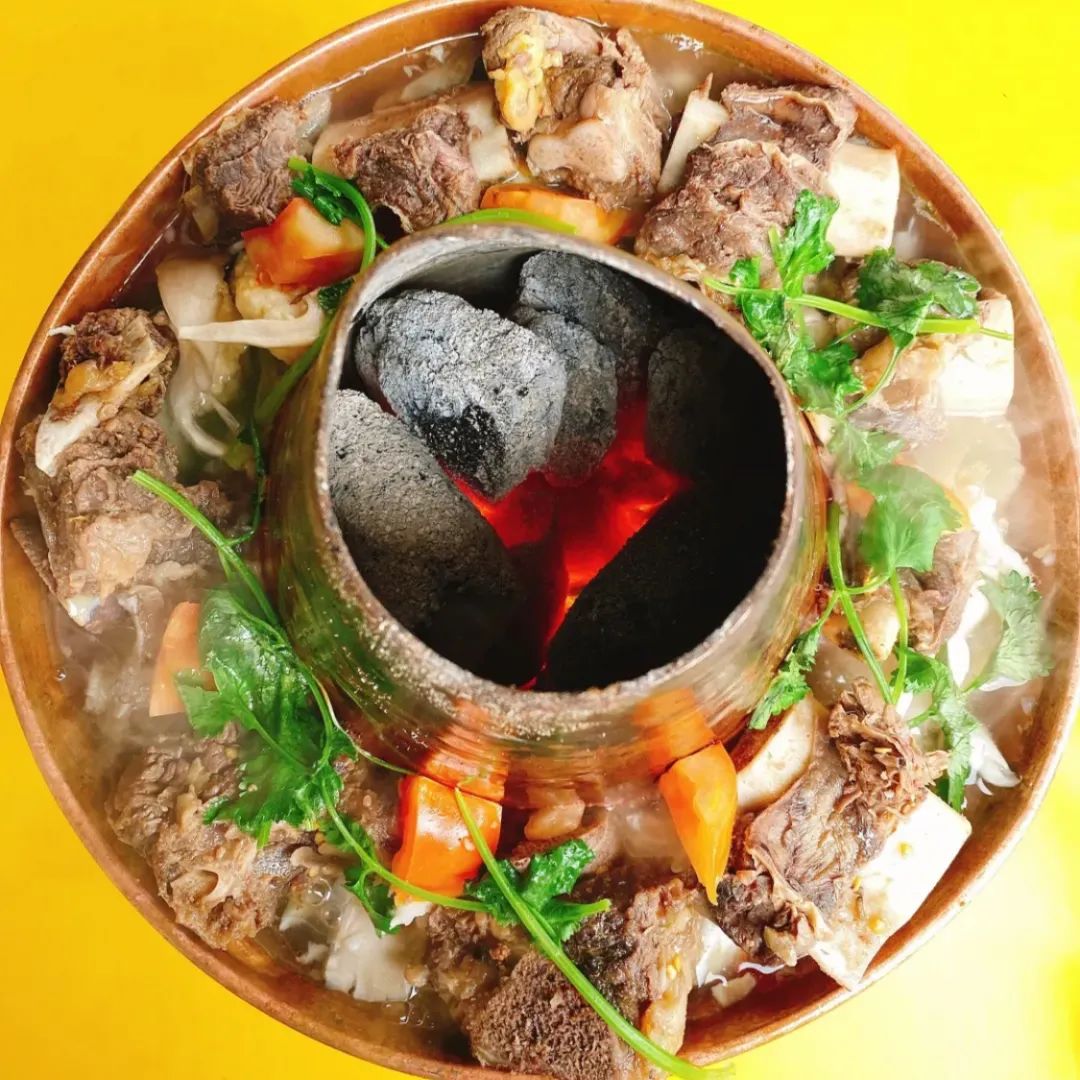 锅里码上香肠、腊肉、笋子等食材,随着火锅沸腾,食物的香味慢慢飘散,沾上秘制酱料,味道简直不摆了,是来茂县必吃美食之一。