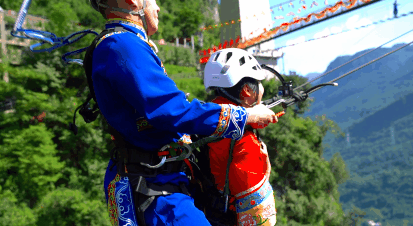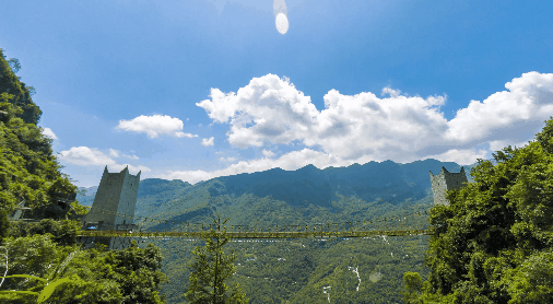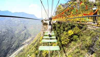 【云中漫步】,适合初次接触挑战的朋友。在几百米高的悬崖上行走跳跃,两侧没有护栏,脚下是一块块木板,在紧张到腿软的同时,还能360°欣赏山间美景。