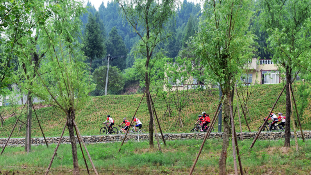 孩童在河溪边欢快地奔跑,骑行者们一队一队在骑游步道骑行,步行者们悠悠漫步。
