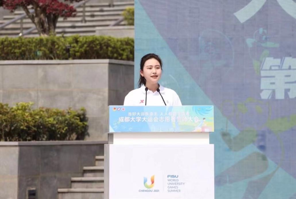 2022年3月“中国大学生自强之星”奖学金获得者王童在“成都大学大运会志愿者誓师大会”作为代表发言