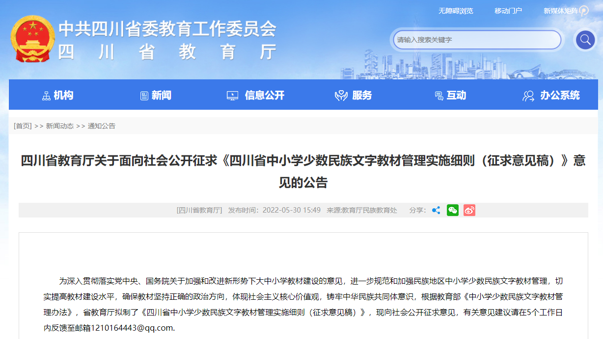 四川发布客户端消息 记者从四川省教育厅官网获悉,为进一步规范和加强民族地区中小学少数民族文字教材管理,省教育厅拟制了《四川省中小学少数民族文字教材管理实施细则(征求意见稿)》,自今日起向社会公开征求意见,有关意见建议请在5个工作日内反馈至邮箱1210164443@qq.com。具体如下: