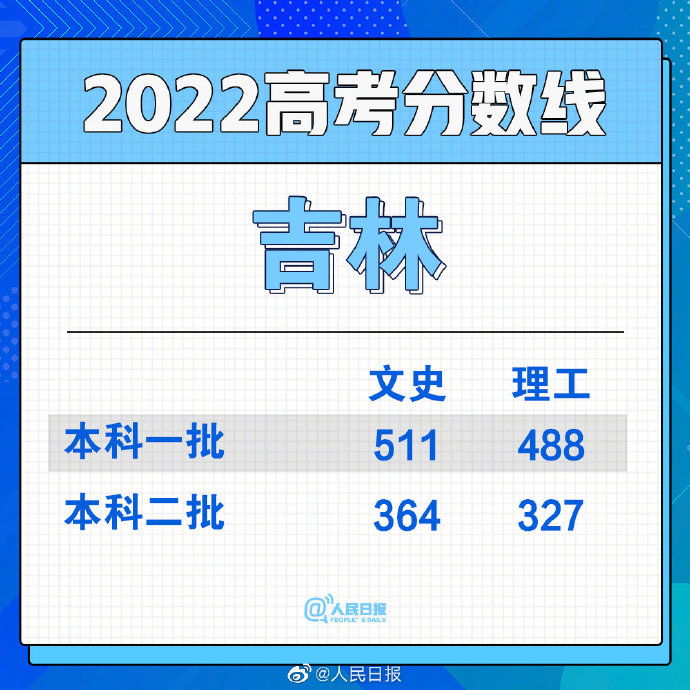 吉林分数线:文史类本科第一批511分,本科第二批364分;理工类本科第一批488分,本科第二批327分。