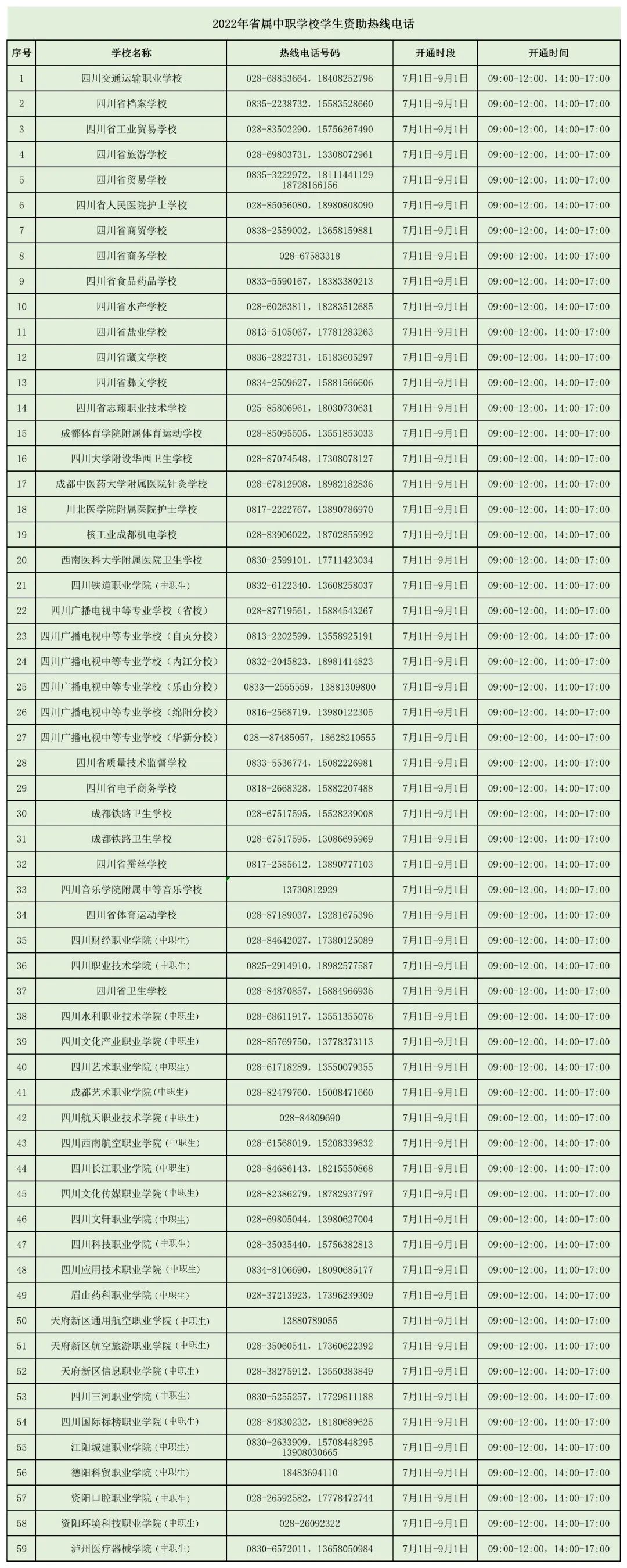 为更好地服务家庭经济困难学生及家长,解除他们的后顾之忧,我省开通了学生资助热线电话,各市(州)、县(市、区)学生资助管理中心、高校和省属中职校也同时开通热线电话,现予以公布。学生和家长还可通过四川学生资助网和“四川学生资助”微信公众号了解学生资助政策。