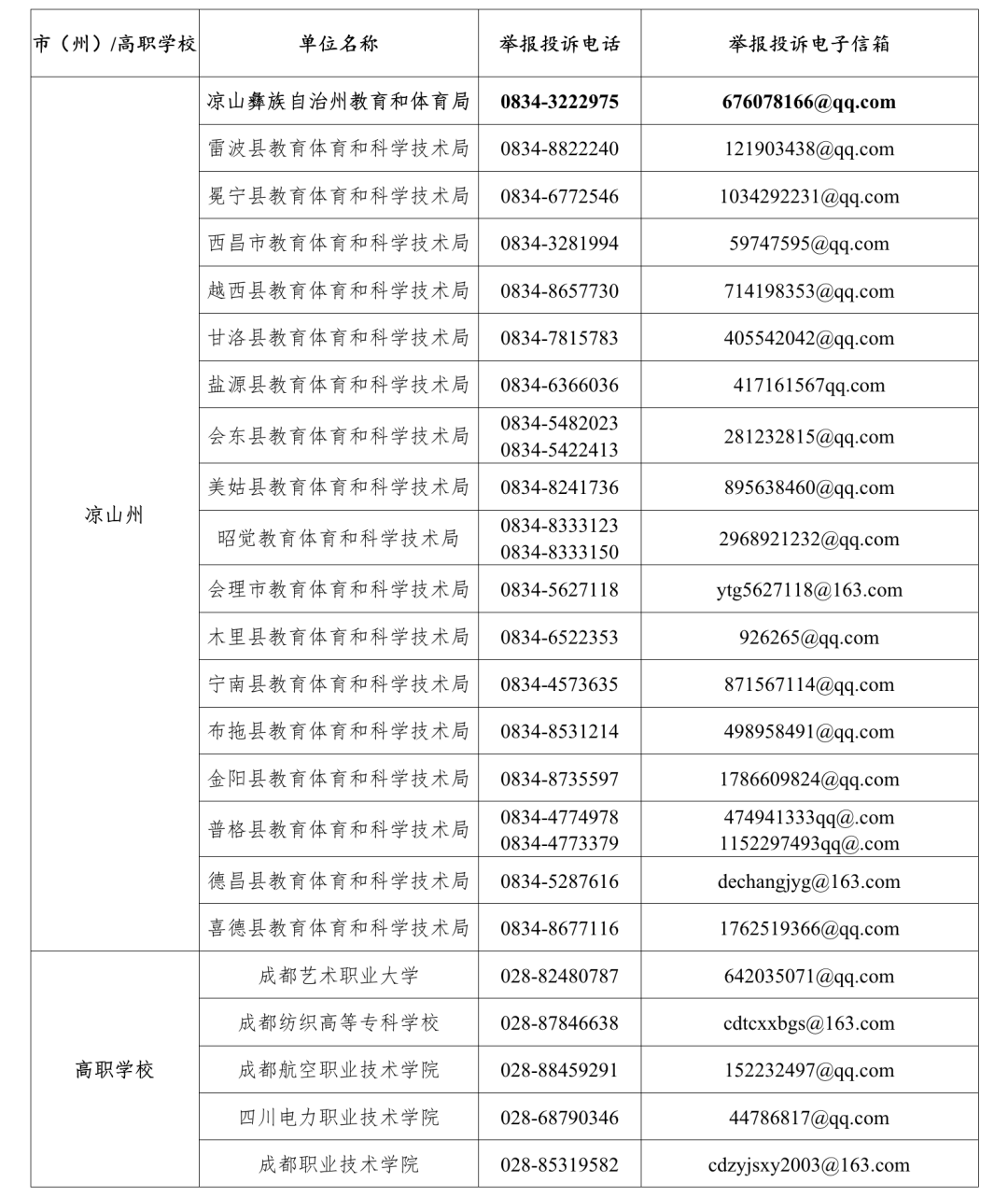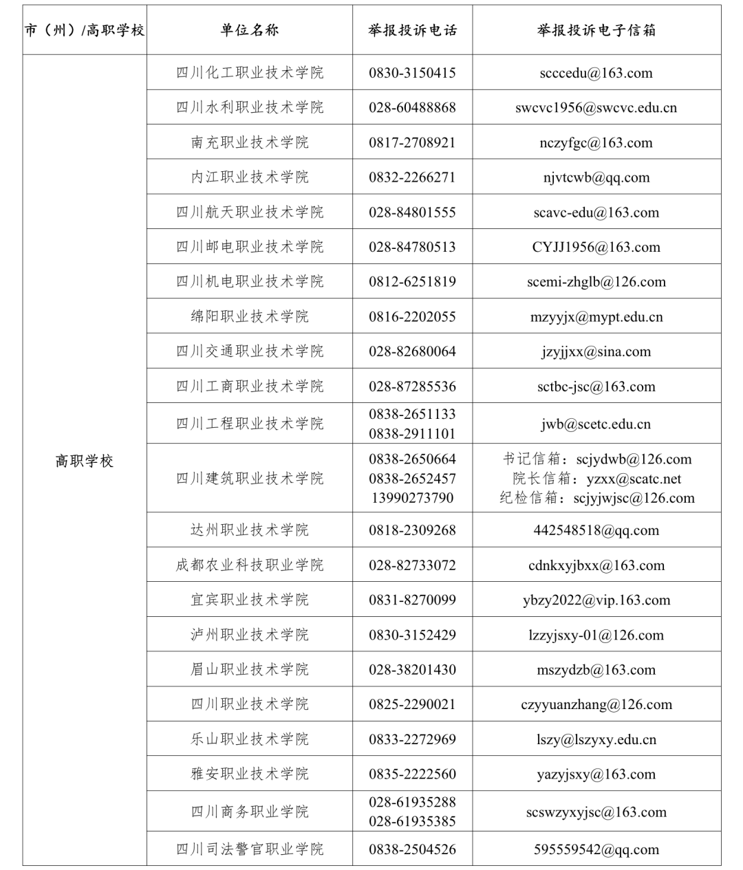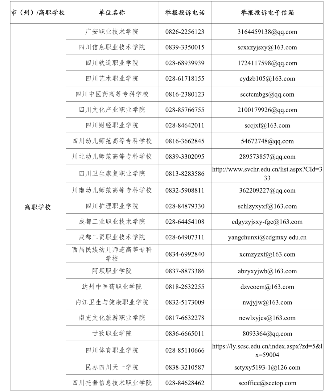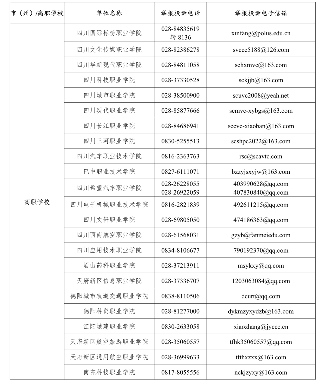 为贯彻落实《四川省人民政府教育督导委员会关于印发〈2022年四川省职业学校办学突出问题专项整治工作方案〉的通知》(川教督委〔2022〕3号)精神,畅通职业学校办学突出问题反映渠道,切实维护学生合法权益,现将四川省职业学校办学突出问题举报投诉电话和电子信箱予以公布。