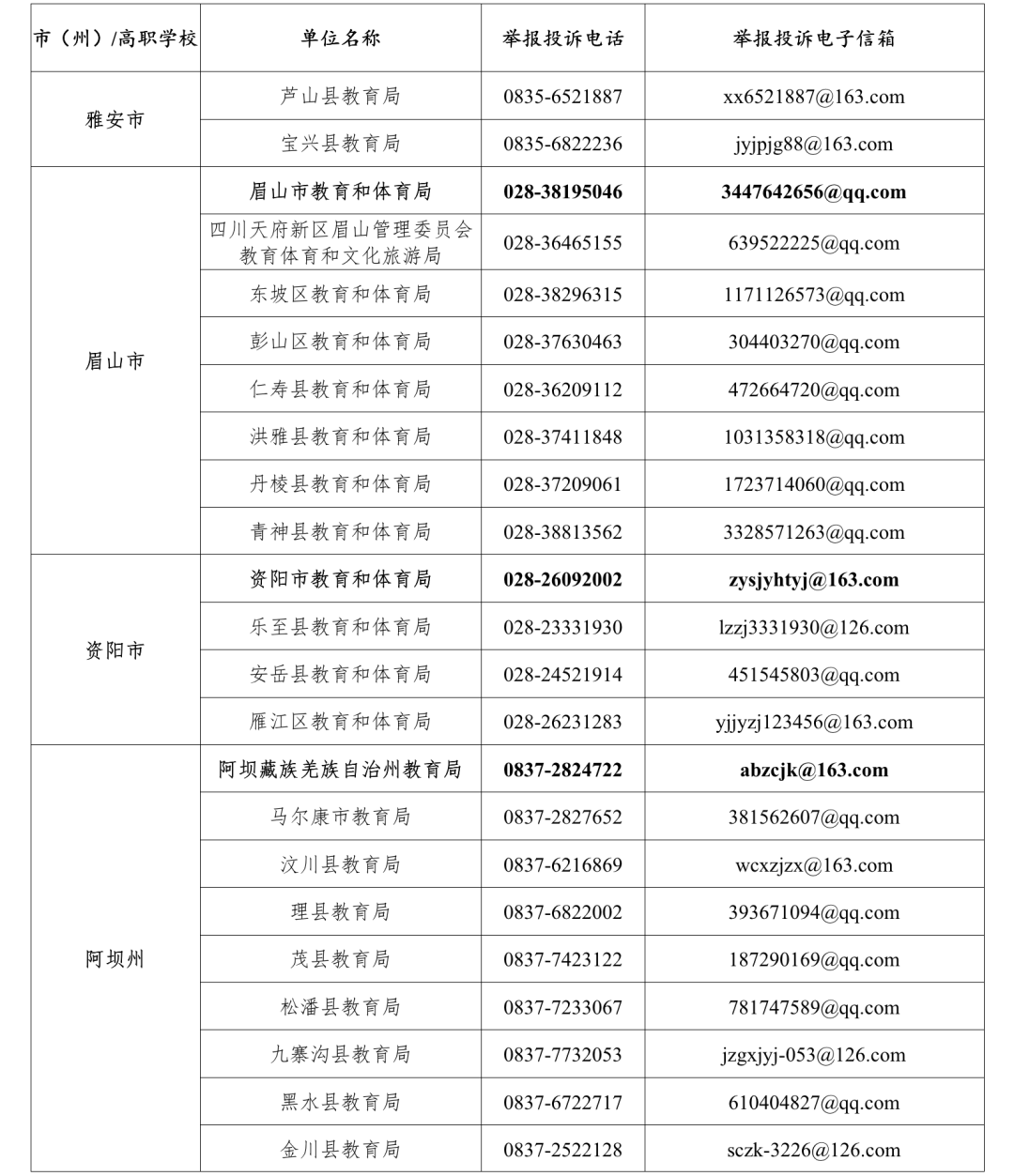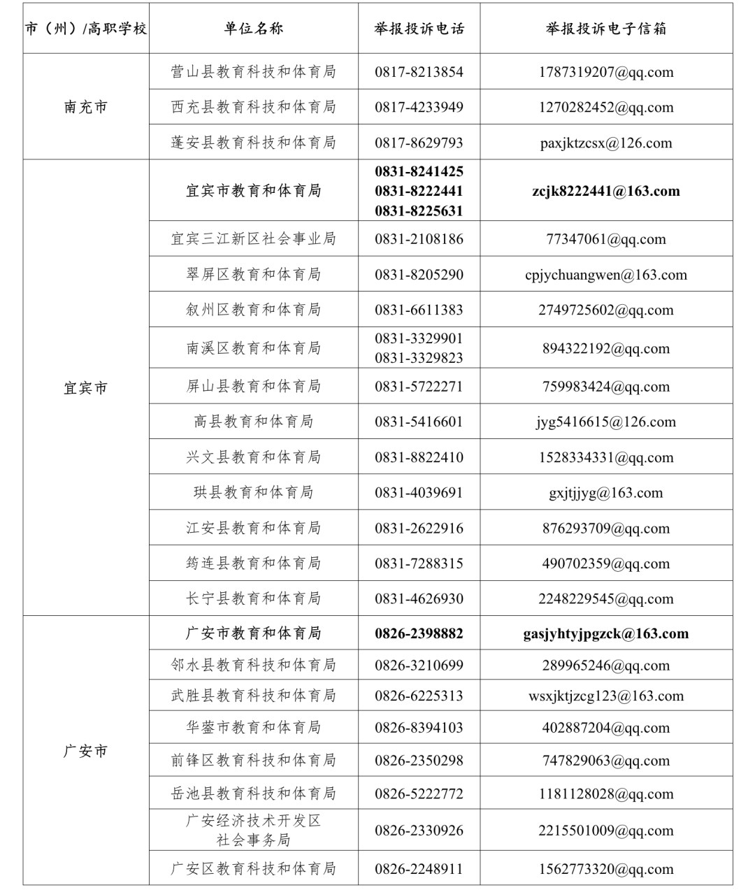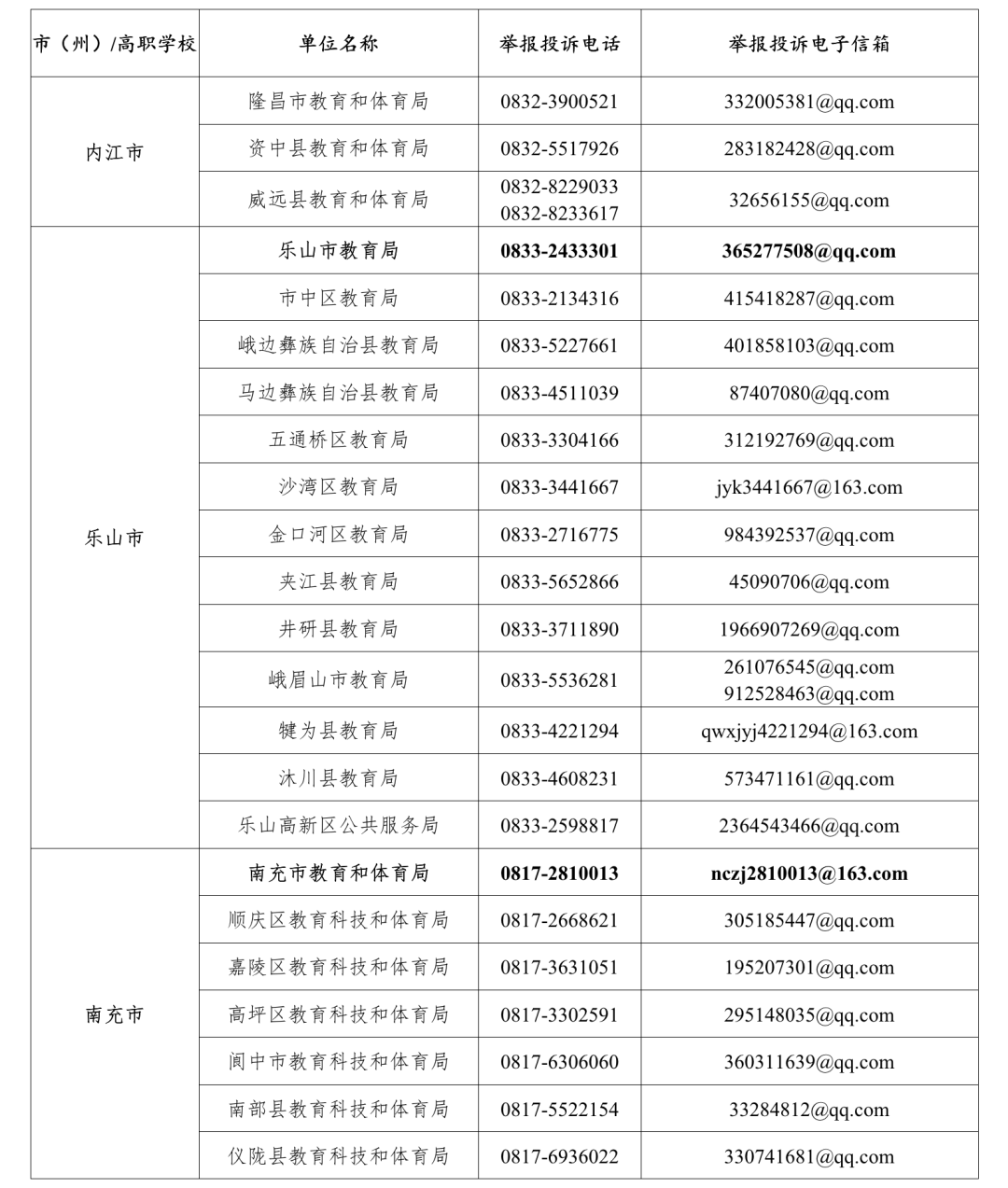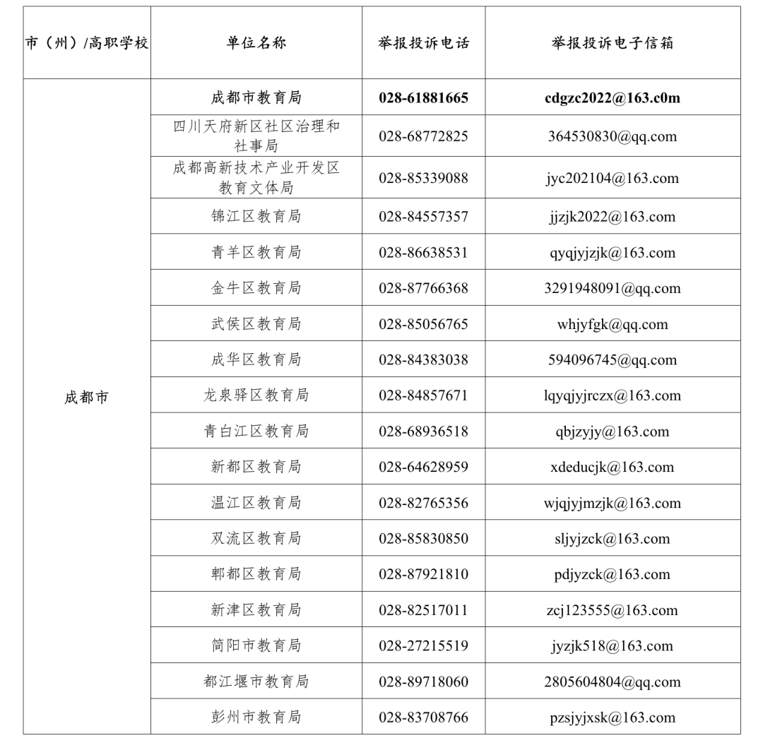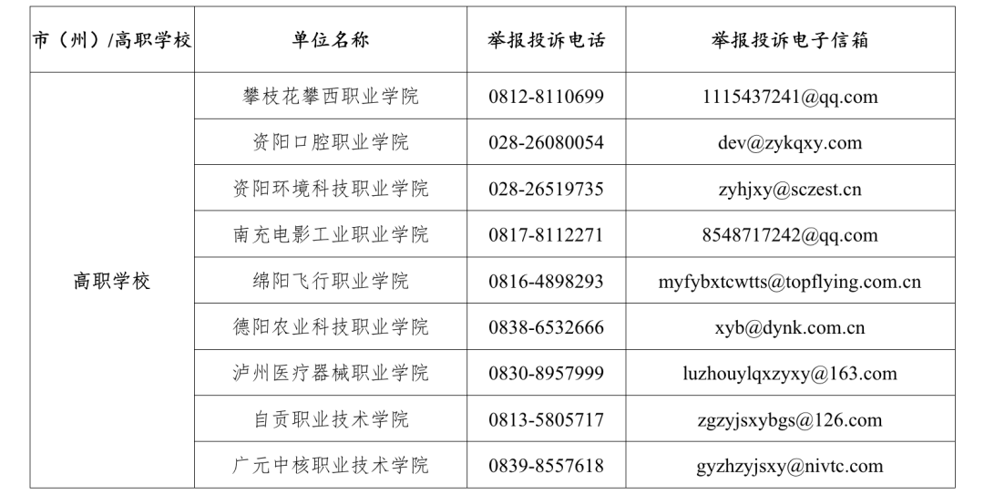 为贯彻落实《四川省人民政府教育督导委员会关于印发〈2022年四川省职业学校办学突出问题专项整治工作方案〉的通知》(川教督委〔2022〕3号)精神,畅通职业学校办学突出问题反映渠道,切实维护学生合法权益,现将四川省职业学校办学突出问题举报投诉电话和电子信箱予以公布。