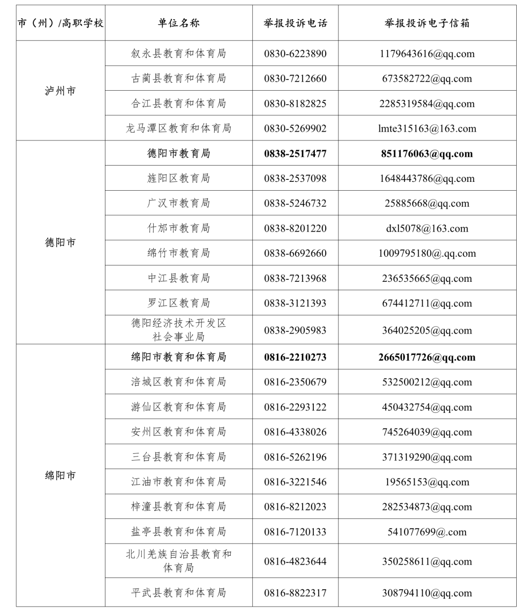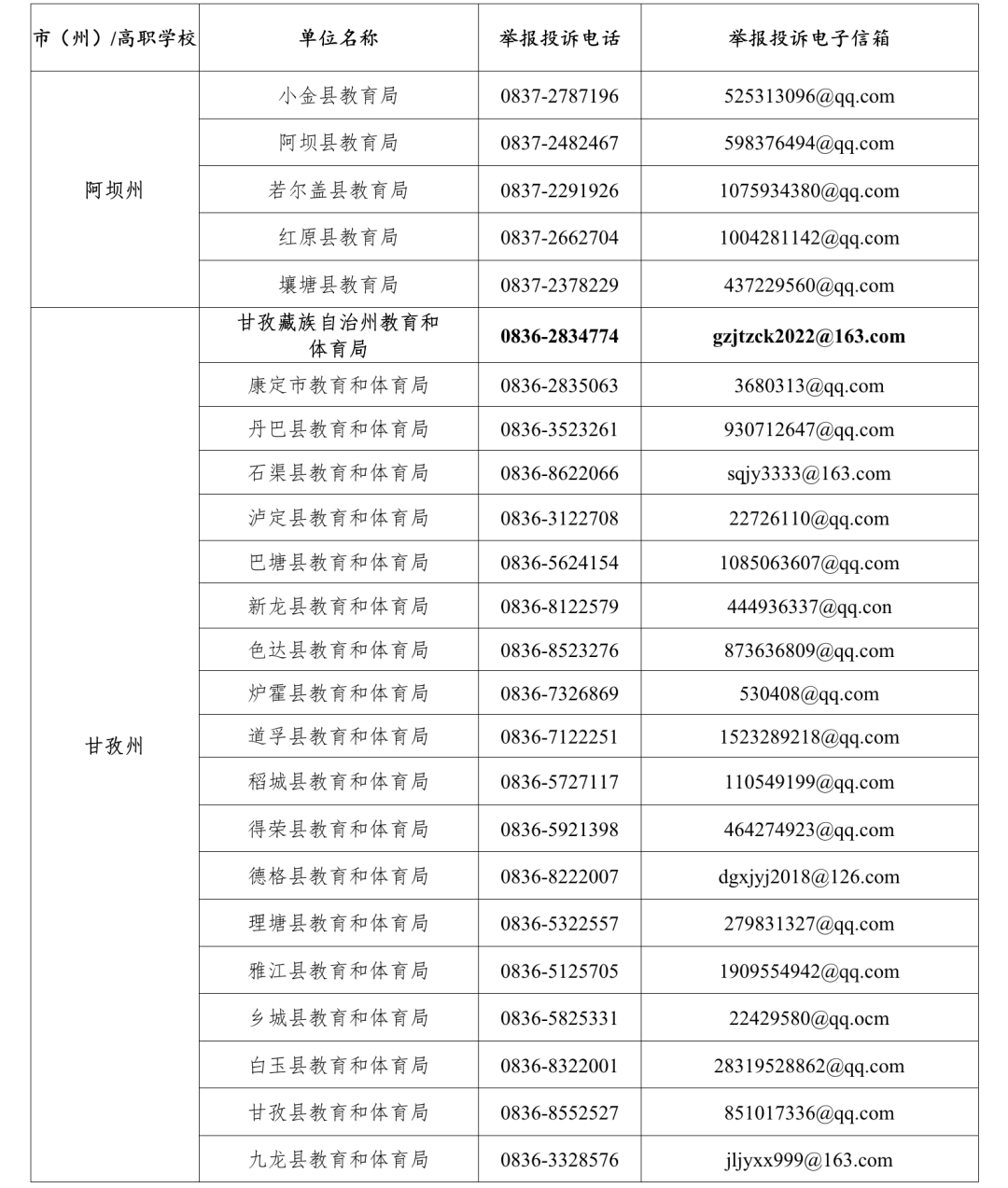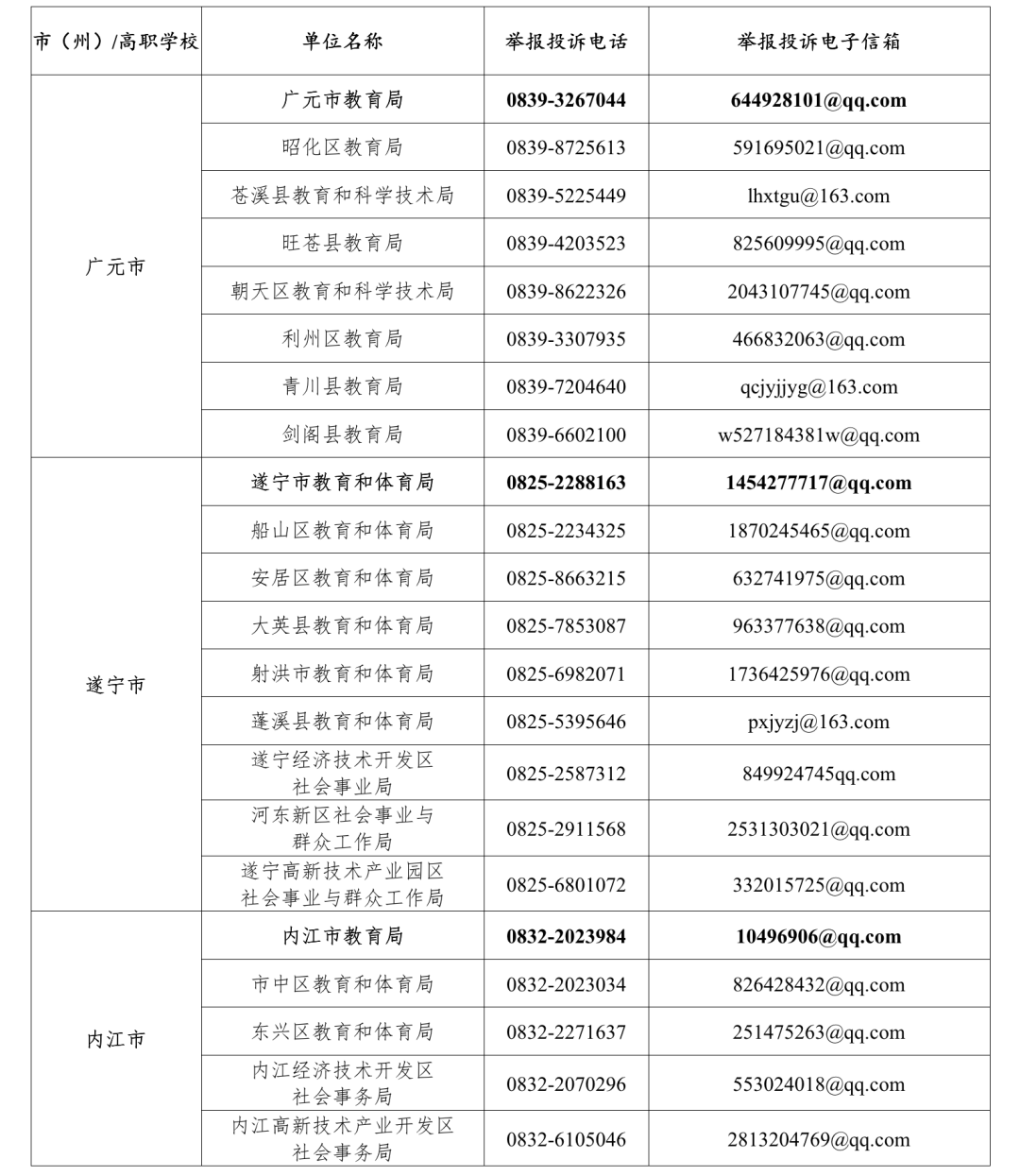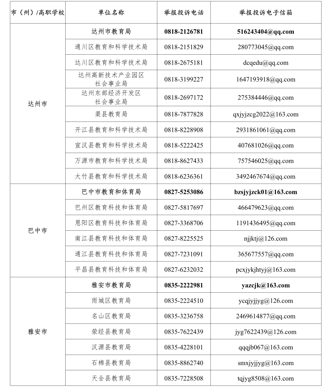 为贯彻落实《四川省人民政府教育督导委员会关于印发〈2022年四川省职业学校办学突出问题专项整治工作方案〉的通知》(川教督委〔2022〕3号)精神,畅通职业学校办学突出问题反映渠道,切实维护学生合法权益,现将四川省职业学校办学突出问题举报投诉电话和电子信箱予以公布。