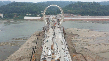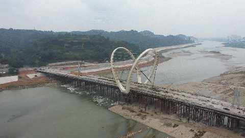 记者近日在彭山区岷江大桥拆除重建项目施工现场看到,两道环形钢拱塔已竖立在大桥桥面上,工人们正在抓紧完成钢索架设、桥面两侧的人行道台阶铺设等工作。