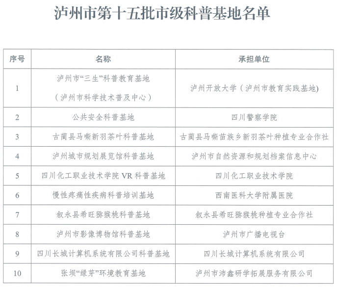为加强我市科普能力建设,更好发挥市级科普基地在科技创新普及和传播方面的示范、引领和带动作用,按照《泸州市市级科普基地管理办法》 (泸市科人 [2022]26 号)有关规定,经单位申报、区县科技主管部门推荐、专家会议评审、现场考察和向社会公示等程序,现命名泸州开放大学等10家单位为泸州市第十五批市级科普基地。