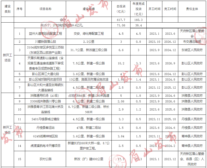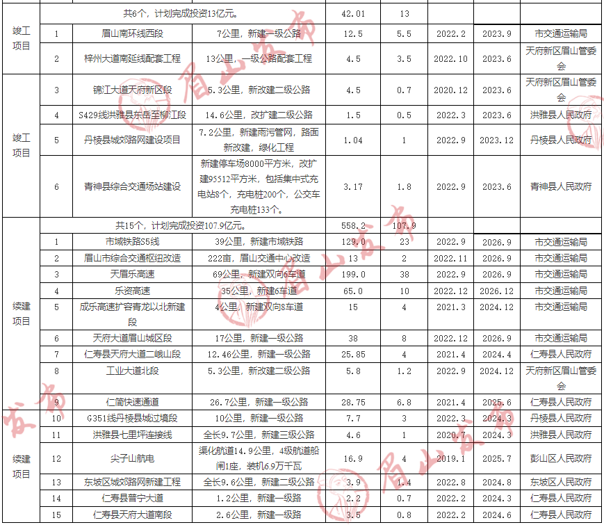 ●开工建设川藏铁路眉山段、天眉乐高速彭山连接线等14个项目,总投资53.76亿元,完成年度计划投资22.1亿元。