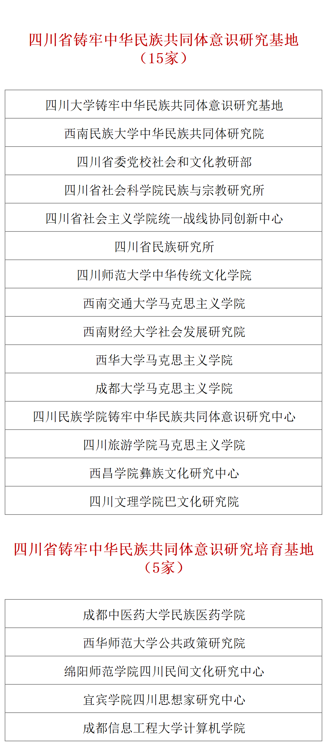 为贯彻落实习近平总书记在中央政治局第九次集体学习时的重要讲话精神,夯实铸牢中华民族共同体意识的理论基础,四川省委统战部、省委宣传部、省教育厅、省民族宗教委日前联合印发《关于命名全省铸牢中华民族共同体意识研究(培育)基地(2023—2025年)的通知》,决定命名全省首批铸牢中华民族共同体意识研究(培育)基地。经过公开申报、联合筛选、实地考察等程序,四部门研究决定命名四川大学铸牢中华民族共同体意识研究基地等15家单位为四川省铸牢中华民族共同体意识研究基地,成都中医药大学民族医药学院等5家单位为四川省铸牢中华民族共同体意识研究培育基地。