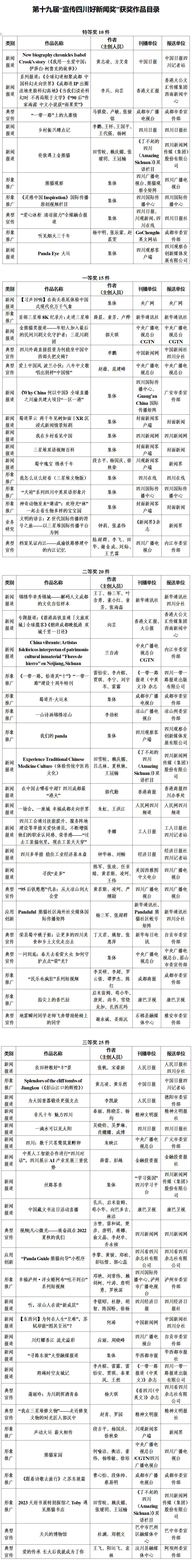 四川发布客户端消息 根据第十九届“宣传四川好新闻奖”评选工作总体方案,通过单位推荐方式征集了2021年1月至2023年10月期间对外宣传四川的优秀新闻作品,由相关领域专家组成的评审委员会对作品进行了评审,评选出特等奖10件、一等奖15件、二等奖20件、三等奖25件(作品目录见附件)。