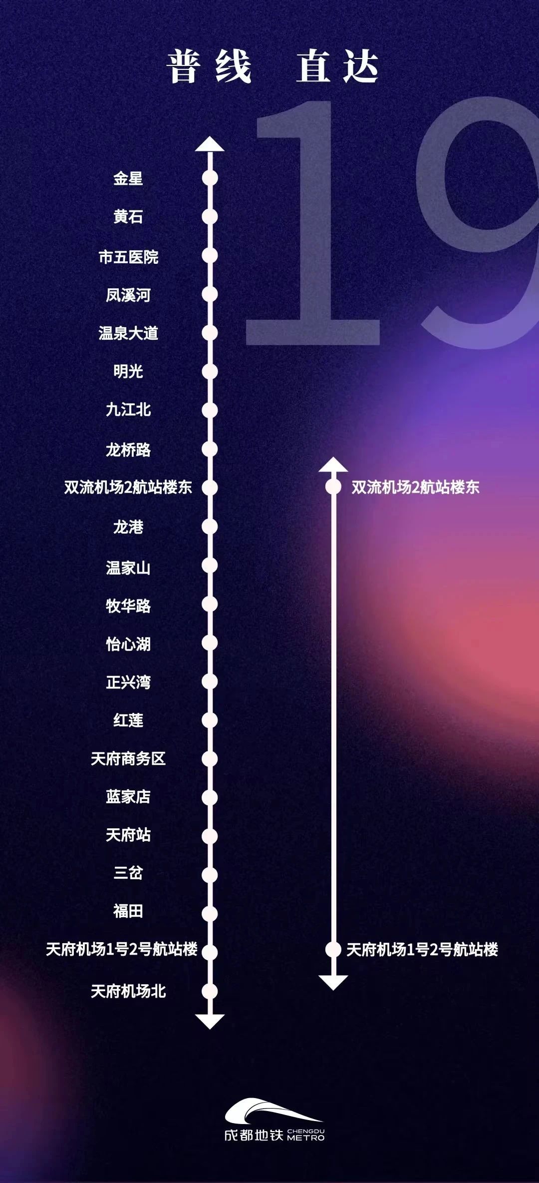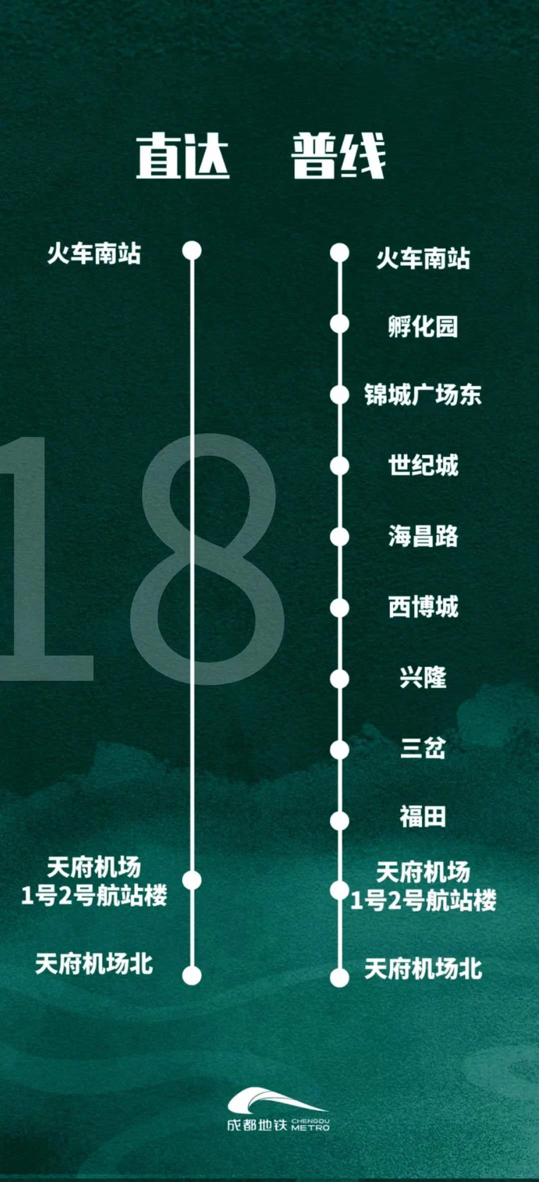 地铁18、19号线均采用“直达+普线”列车运行组织方式。其中,18号线直达车停靠站点为火车南站、天府机场1号2号航站楼、天府机场北。19号线直达车停靠站点为双流机场2航站楼东、天府机场1号2号航站楼。