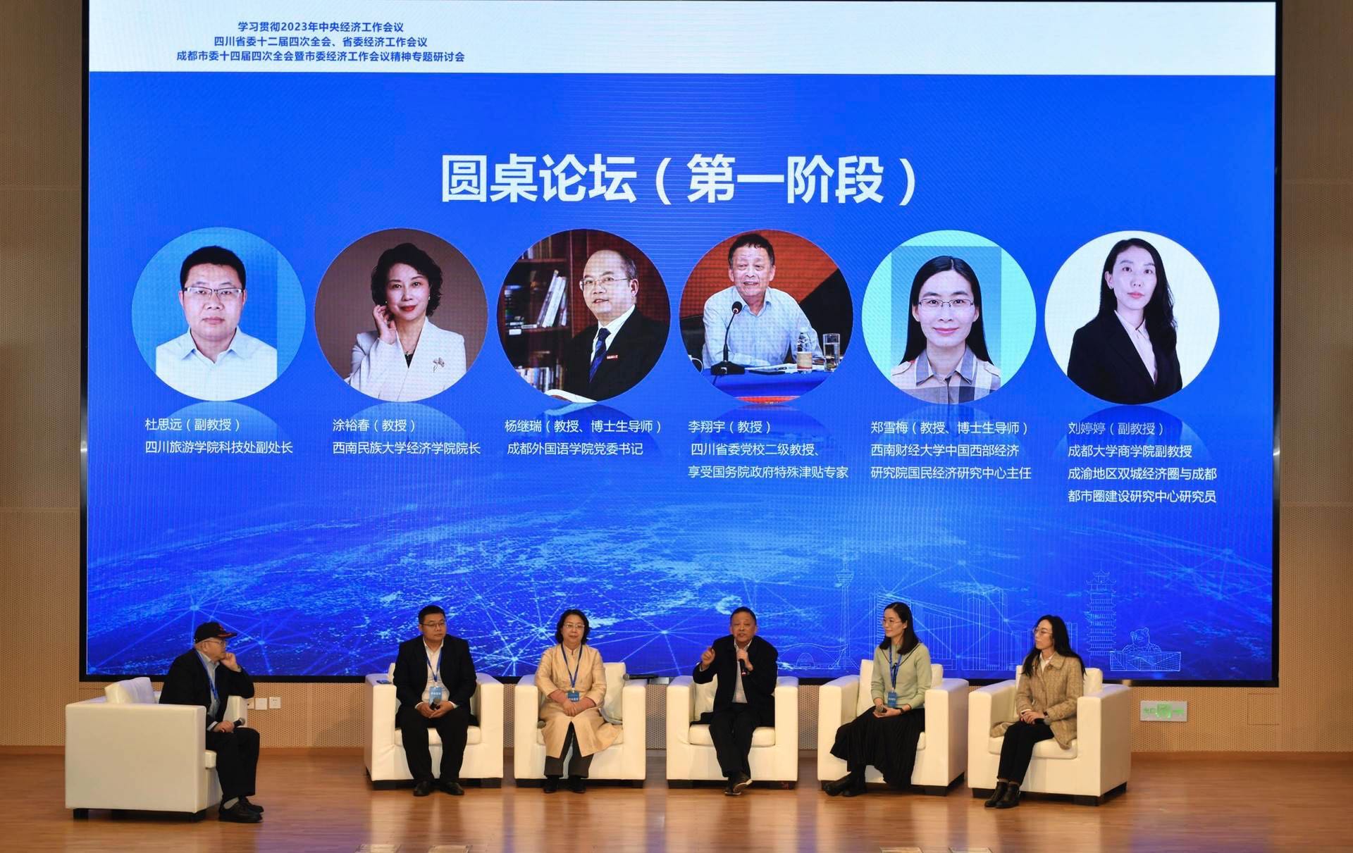 圆桌论坛环节,专家学者们聚焦中央、省市经济工作会议亮点,共同探讨如何把会议精神落到发展实处,并提出推动成都经济高质量发展、成渝地区双城经济圈建设、创新驱动发展推动乡村振兴等方面的具体设想。