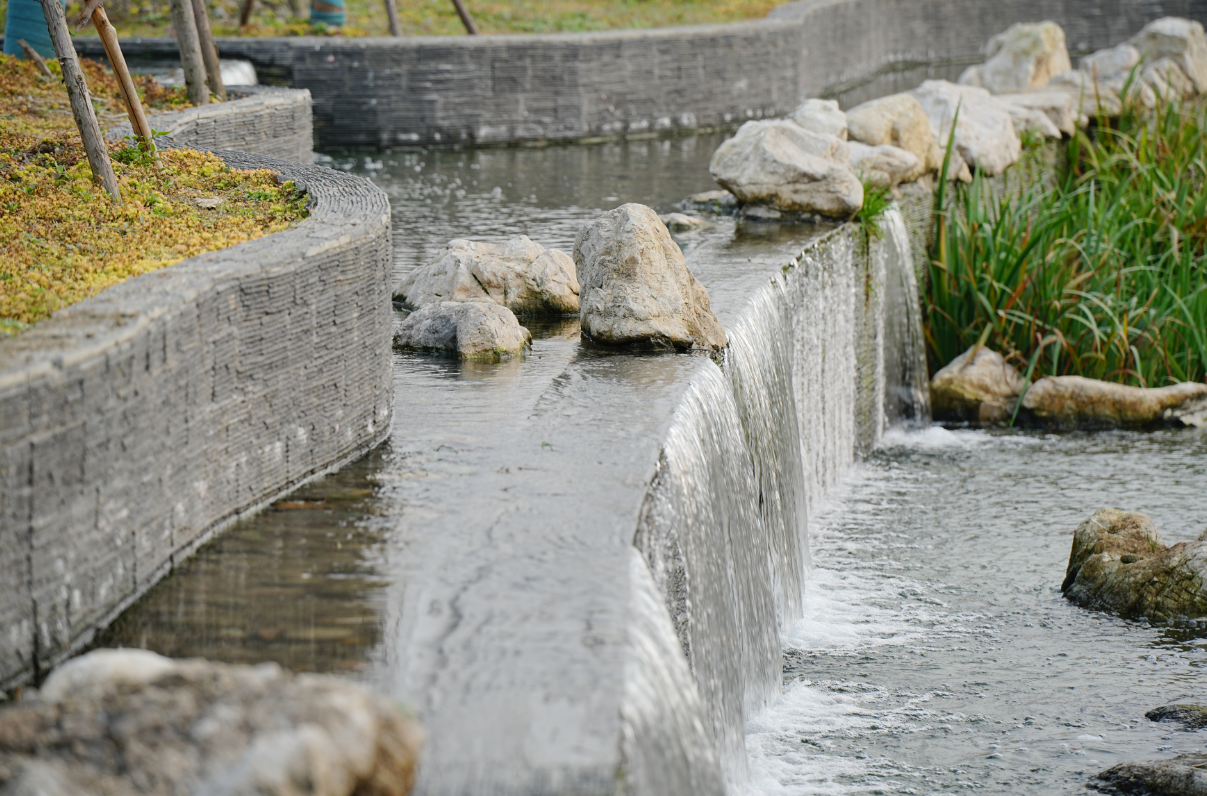 公园采用下流式预埋微生物垂直潜流人工湿地方案,利用人工介质、植物、微生物的物理、化学和生物三重协同作用净化水质。公园水池内铺上砂石,种植各类水生植物有效净化水质,湿地的植物从水中吸收营养,成熟后再进行收割,实现资源的循环利用。