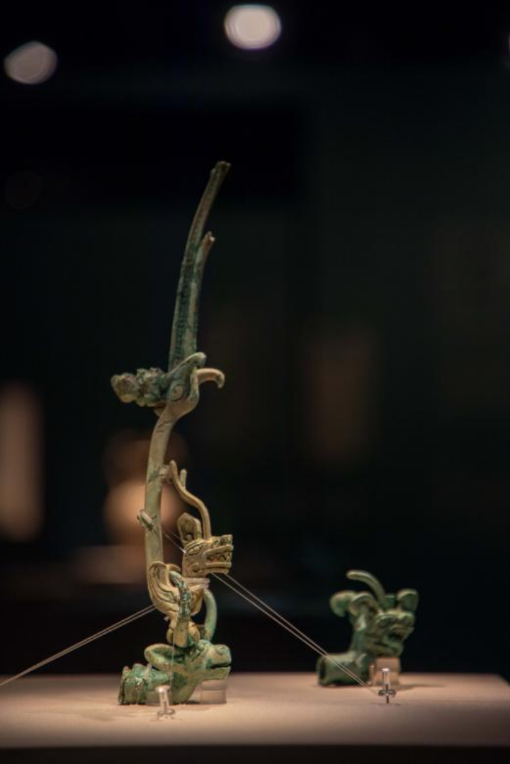 青铜祭坛零件(左) 龙形铜饰(右) 四川广汉市三星堆遗址出土 四川省文物考古研究院藏