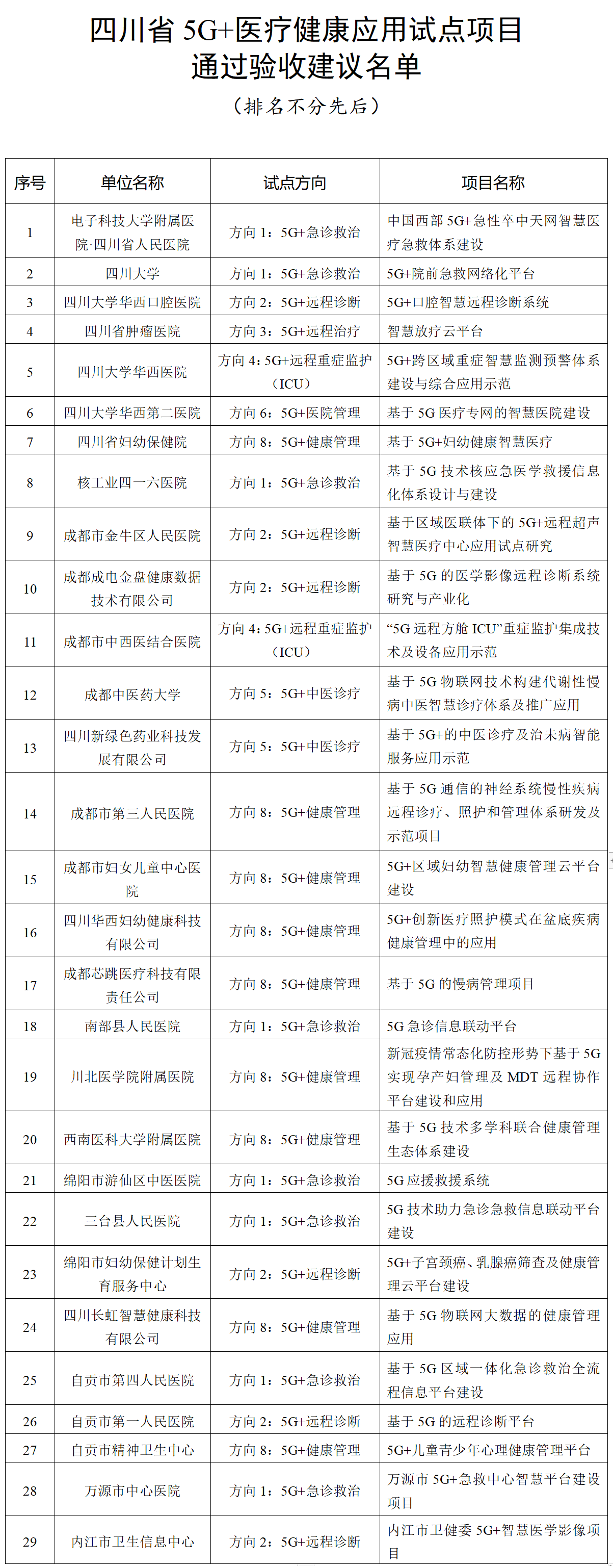 四川发布客户端消息 记者从四川省经济和信息化厅网站获悉,3月5日,四川省5G+医疗健康应用试点项目通过验收建议名单公示,共评审出29个试点项目予以通过验收,公示时间为2024年3月6日—2024年3月12日。