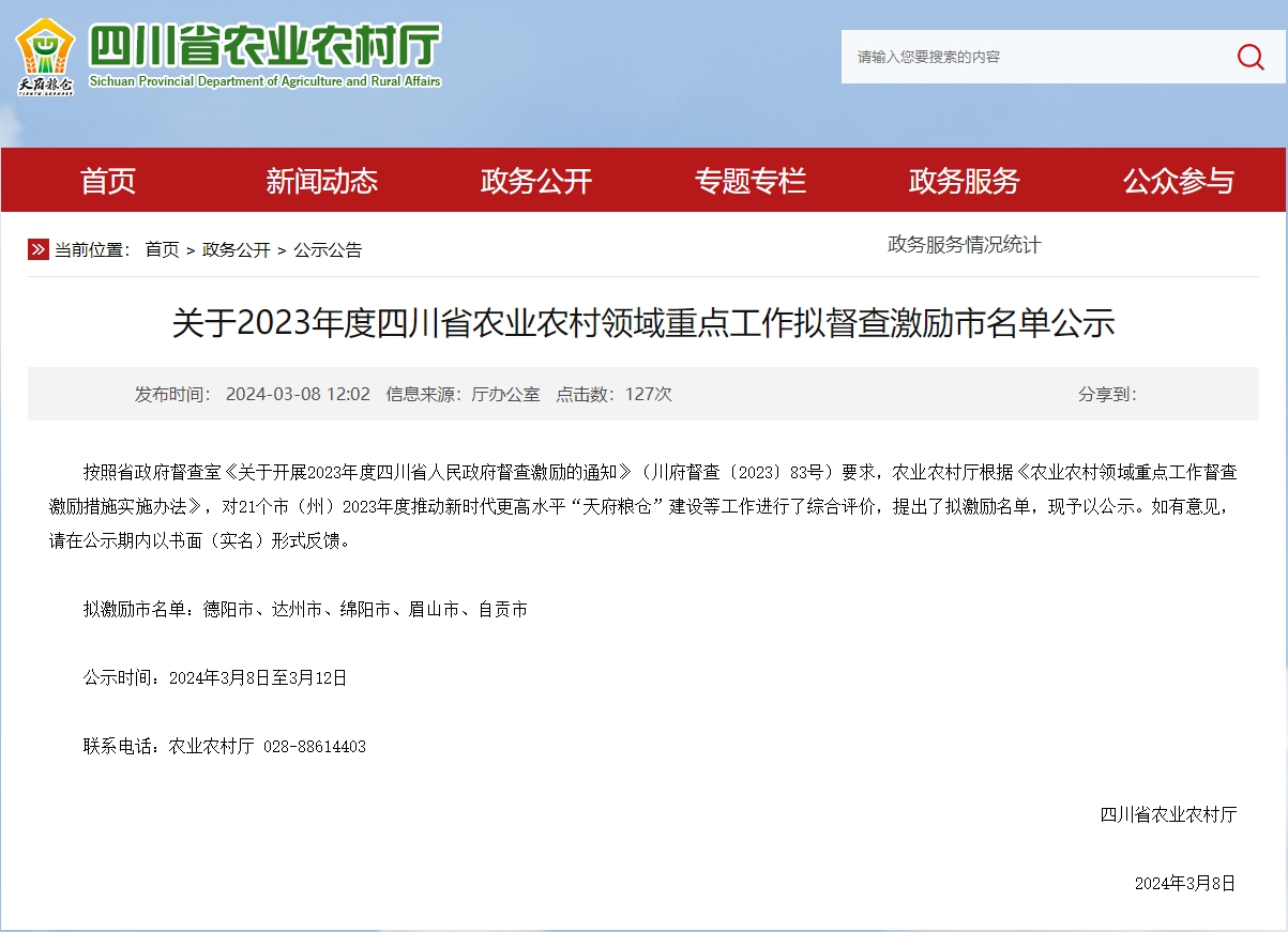 四川发布客户端消息 记者从四川省农业农村厅网站获悉,3月8日,四川省农业农村厅公示2023年度四川省农业农村领域重点工作拟督查激励市名单,公示时间为2024年3月8日至3月12日。