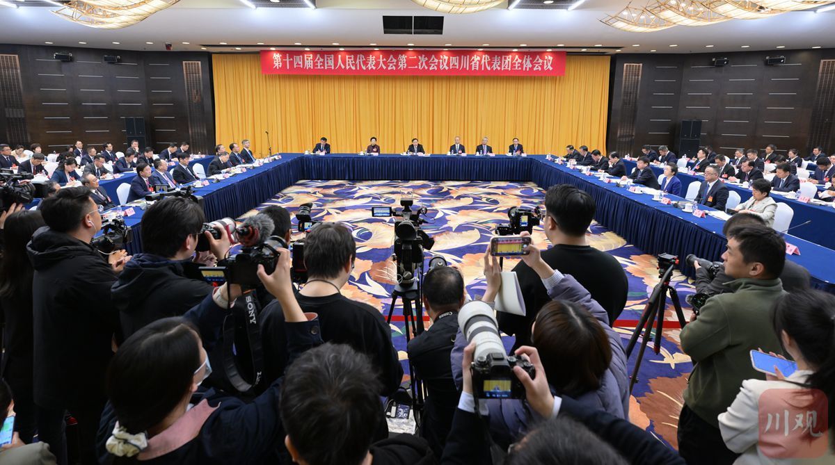 3月10日上午,出席十四届全国人大二次会议的四川代表团在驻地举行全体会议,继续审议全国人大常委会工作报告、最高人民法院工作报告、最高人民检察院工作报告。省委书记、省人大常委会主任、代表团团长王晓晖主持会议。省委副书记、省长、代表团副团长黄强,省委副书记、成都市委书记、代表团副团长施小琳参加。