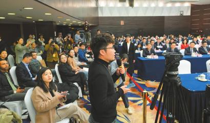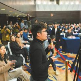 三月十日,出席十四届全国人大二次会议的四川代表团在驻地举行全体会议,并向中外媒体开放。图为人民日报记者在提问。川报集团特派记者欧阳杰摄