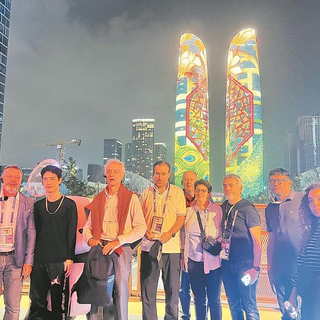 世界羽联年度大会参会嘉宾在双子塔前拍照留念