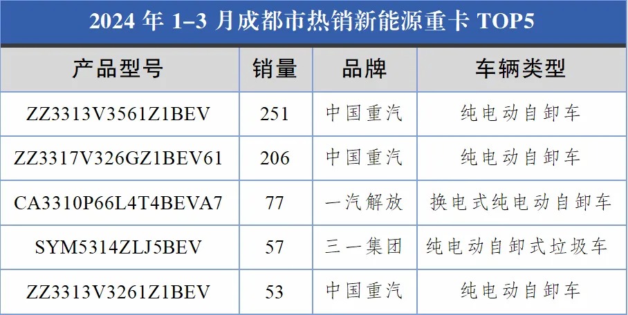 据悉,在成都上牌的1041辆新能源重卡中,自卸车和混凝土搅拌车分别达到806辆和161辆,合计占比超过90%,工程类新能源重卡是目前成都新能源重卡领域的销量担当。今年一季度成都新能源重卡热销车型分别有9款自卸车和3款搅拌车,其中销量TOP5均是自卸车,中国重汽3款车上榜。