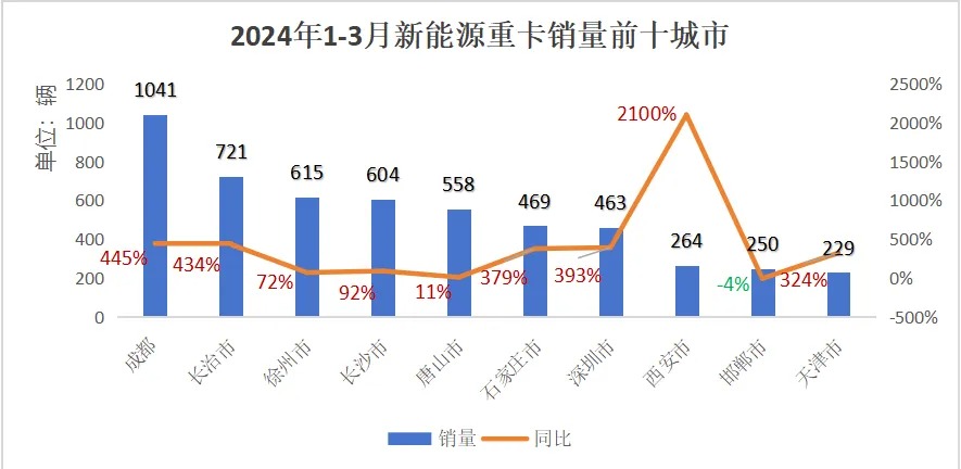 4月26日,记者从成都汽车产业联盟获悉,2024年一季度,全国新能源重卡销量11075辆,销量前10城市共销售5214辆,占全国新能源重卡销量的47.1%,成都市销量排名第一,也是销量唯一超1000辆的城市。