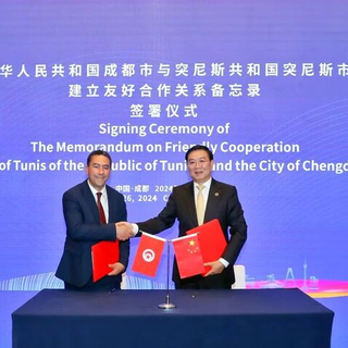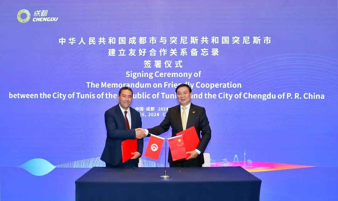 4月26日,成都市与突尼斯共和国突尼斯市建立友好合作关系备忘录签署仪式举行,双方正式建立友好合作关系。至此,成都市国际友好城市和国际友好合作关系城市达112个。市委副书记、市长王凤朝,突尼斯市政务秘书长(当前代行突尼斯市长职责)卡梅尔·埃卢希奇出席签署仪式。
