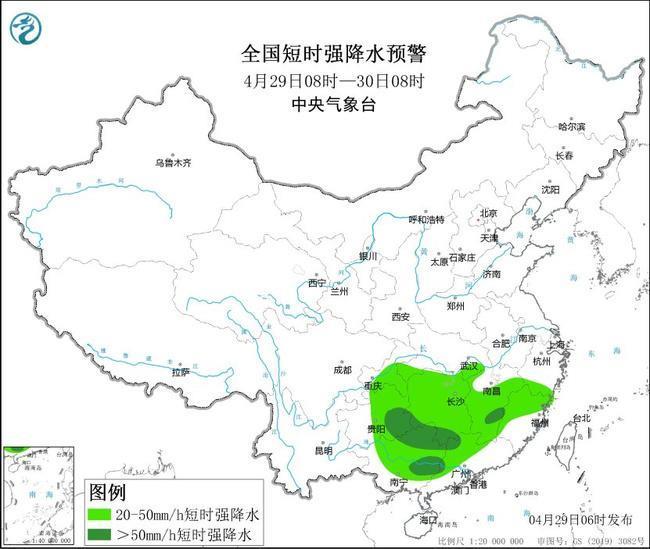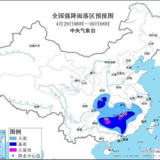 预计,4月29日08时至30日08时,湖北西部和东南部、安徽南部、浙江西南部、四川盆地东部、重庆、贵州东部、湖南、江西、福建西部、广西东北部、广东中北部等地部分地区有大到暴雨,其中,湖南中部、江西中部、贵州东南部、广西东北部等地部分地区有大暴雨(100~200毫米)。上述部分地区伴有短时强降水(最大小时降雨量30~60毫米,局地可超过80毫米),局地有雷暴大风或冰雹等强对流天气。