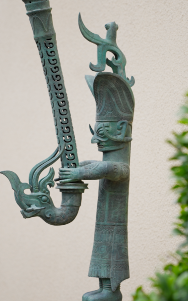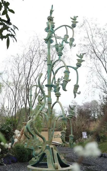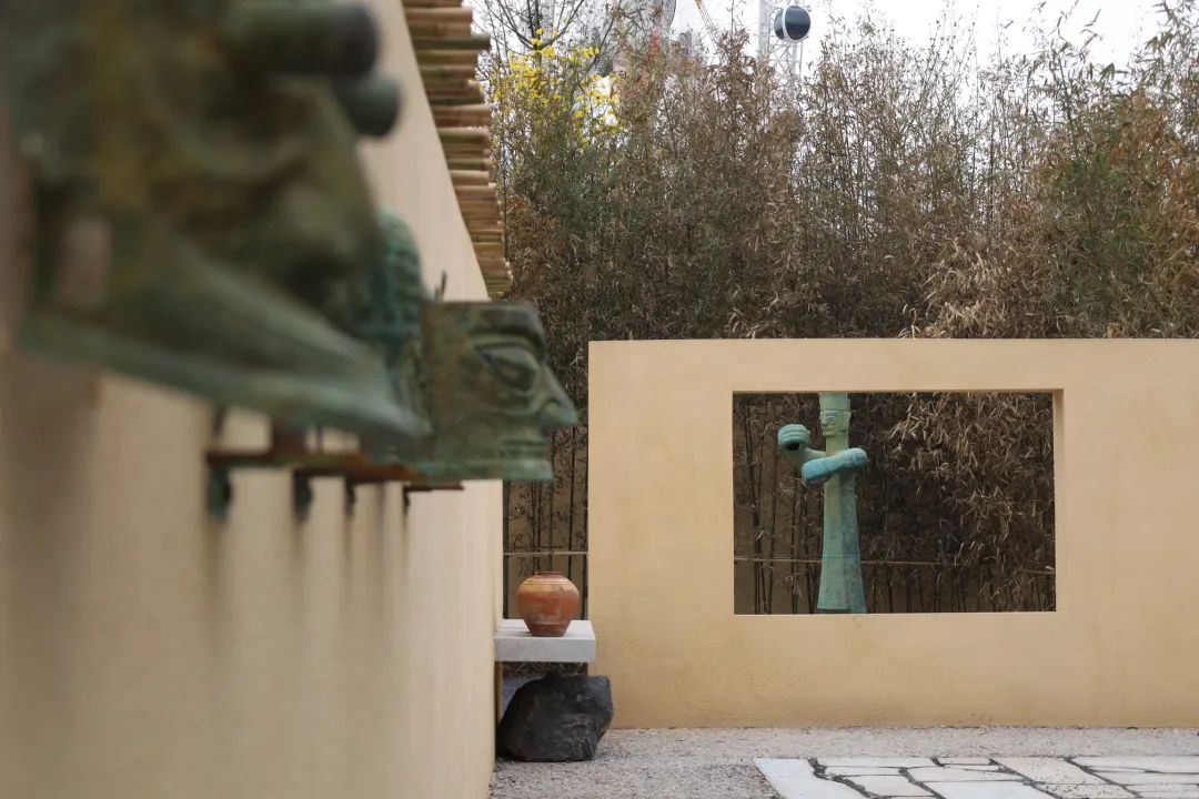 展区最大的特色就是突出了三星堆文化。展区的景观装置大量复刻三星堆出土的文物,包括青铜神树、青铜面具、青铜鸟、陶器等特色物品,分别放置在展区各区域。