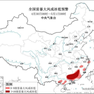 预计4月30日8时至5月1日8时,湖南南部、江西东部和南部、浙江东部、福建北部和西南部、广西东部和南部、广东西部和中北部等地的部分地区将有8级以上雷暴大风或冰雹天气,其中江西南部、福建西南部、广西东北部、广东北部等地的部分地区将有10级以上雷暴大风,最大风力12级以上,并可能有龙卷;