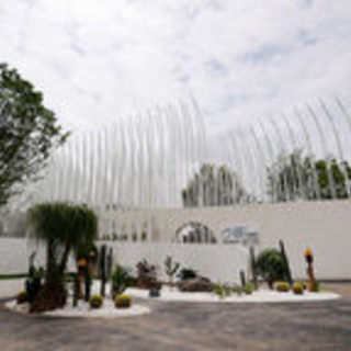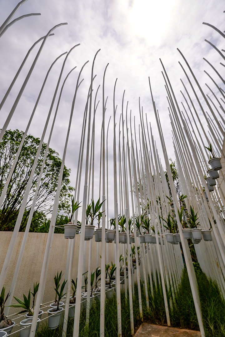 第三展区为“逐梦千帆”。在此处游客沿着溪流可以欣赏风帆造型的驳岸线;第二条线路的选择可以沿着椰子壳马赛克打造的阶梯走廊往上走,在架空的平台上可以观赏到展馆建筑的外轮廓,也可以俯瞰层层植物打造的雨林秘境。