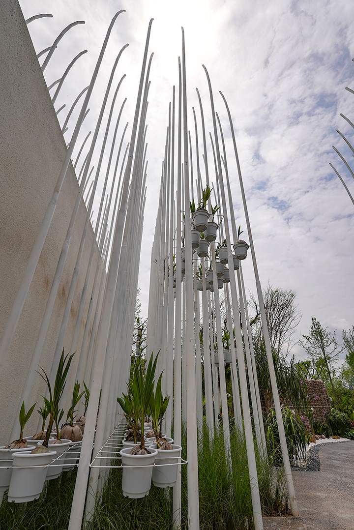第二展区为“仿生湿地”。采用晒干的椰子皮作为铺装材料,模拟了红树林湿地的景观,营造出独特的氛围。