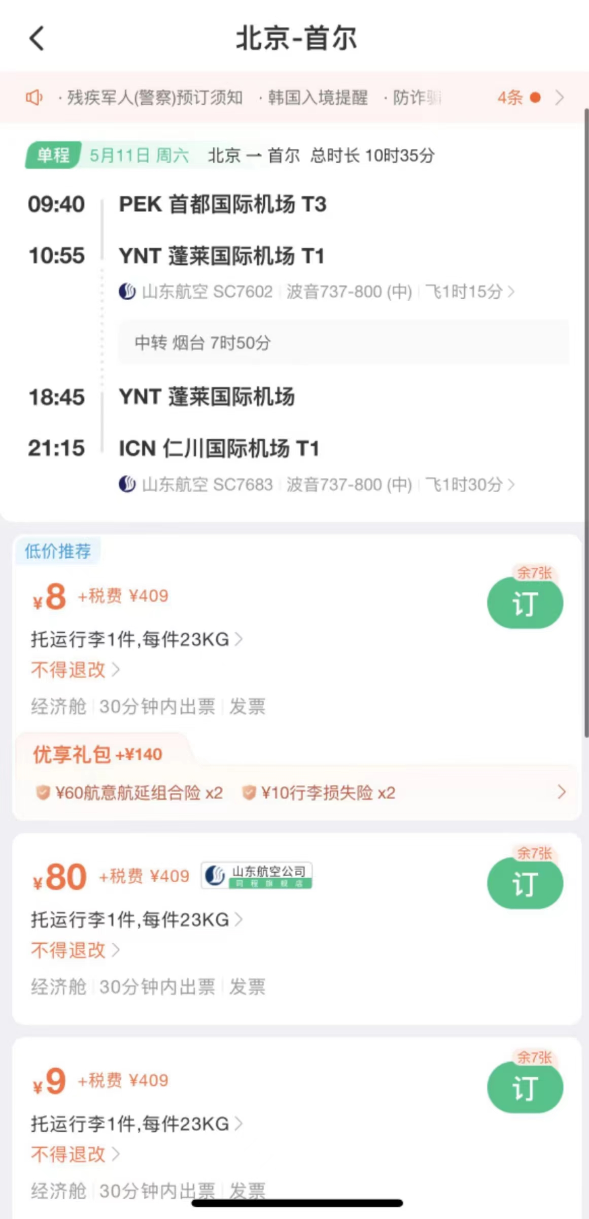 在线旅行平台显示,5月11日北京飞往首尔的一趟航班机票(不含税)价格低至8元。加上税费之后价格是417元。