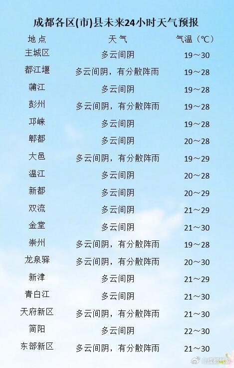 根据最新气象资料分析,未来三天,蓉城白天都是阳光伴云朵,并有分散阵雨。在阳光关照下,日最高气温在30℃上下,妥妥的夏季体感。