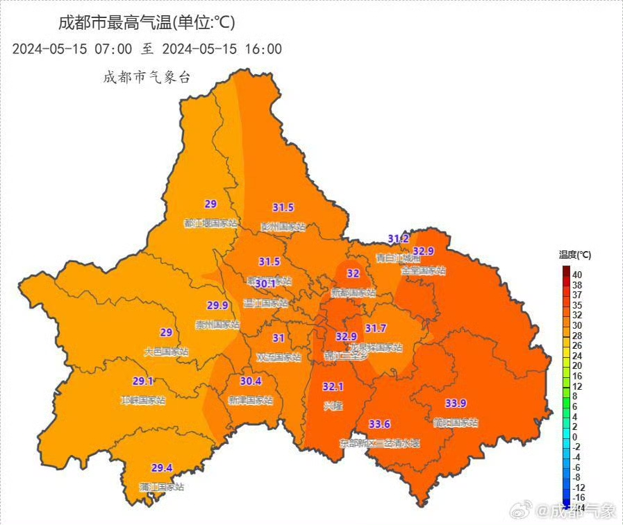 截至今日16时,全市最高气温33.9℃,出现在简阳,全市最高气温平均值为31.2℃。