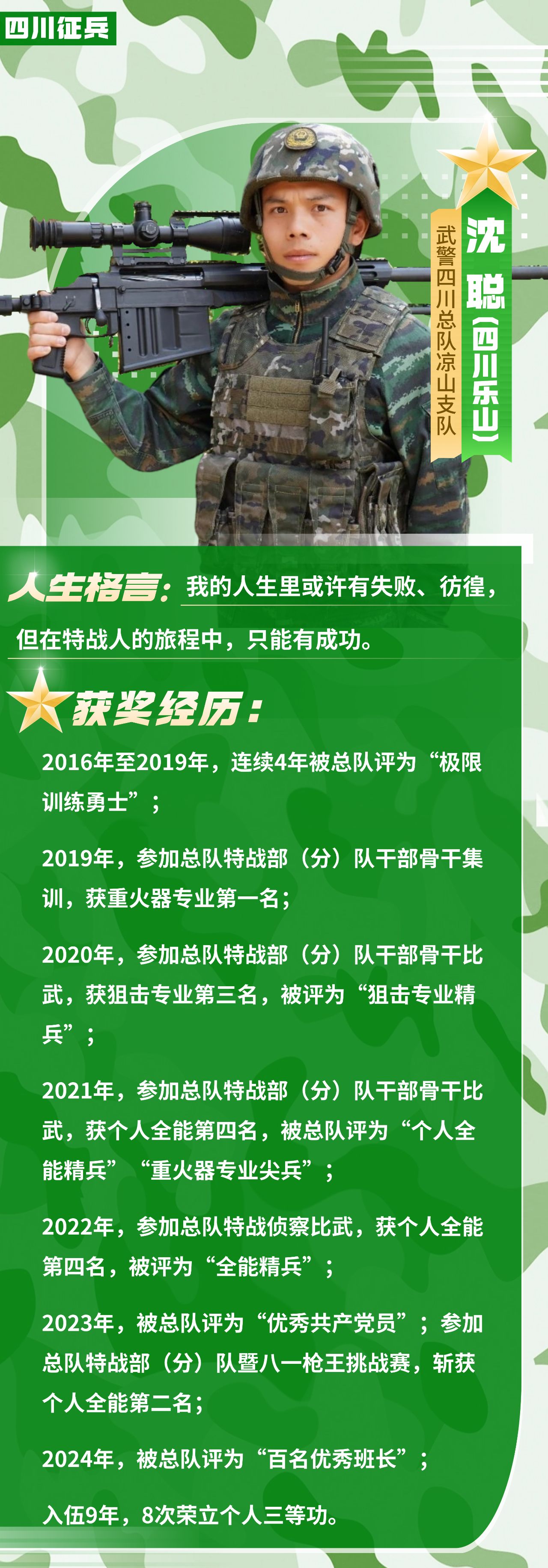 在沈聪的坚持下,只过了大半年,他的训练成绩就突飞猛进。在部队的这9年,沈聪先后参加了20余次极限训练。面对每天训练18小时、负重30公斤、全程180余公里的极限训练,他始终站在队伍的最前方。就这样凭着一股拼命三郎的冲劲,连续四年获得“极限训练勇士勋章”。