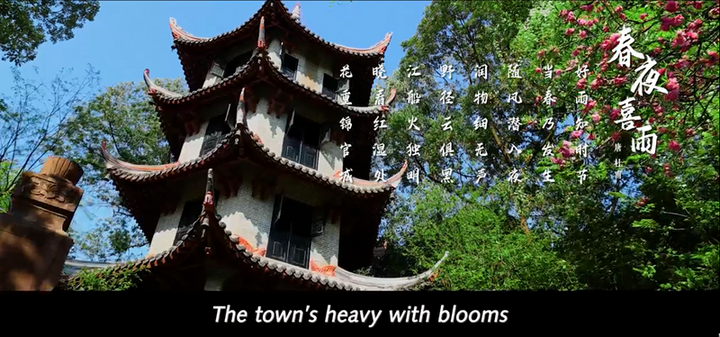 据了解,《诗词里的成都》系列短视频共3期,采取中英文结合的方式,精选《春夜喜雨》《绝句》《登锦城散花楼》3篇描写成都的古诗词进行创作,将武侯祠、杜甫草堂、安顺廊桥、黄龙溪古镇、西岭雪山等成都知名景点融入其中。视频中,古诗词的韵味与成都的秀美风光相互交融,将观众带入一个充满诗意与浪漫的世界。