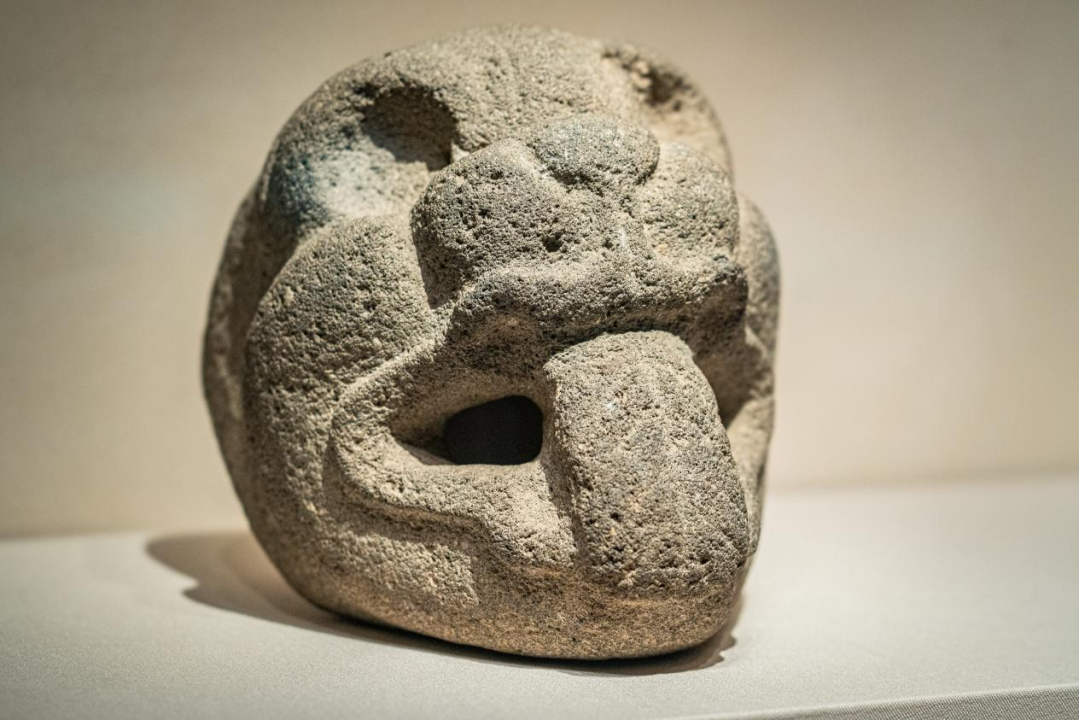 奥尔梅克文明在公元前1500年就已颇具规模,被誉为“中美洲文明之母”,其艺术成就以宏伟的巨石雕像和建筑闻名。本次展出的兽形豹人石雕,以夸张的面部处理诉说着奥尔梅克人对力量与威严的崇尚。最为世人所熟知的玛雅文明从公元前500年持续到1100年,以其精湛的天文学知识、复杂的历法体系和独特的象形文字,成为中美洲文明中的一颗耀眼明珠。美洲豹战士彩绘陶盘描绘了一位身披美洲豹皮的战士,鲜明的黑色与红色中,英勇的战士蓄势待发。