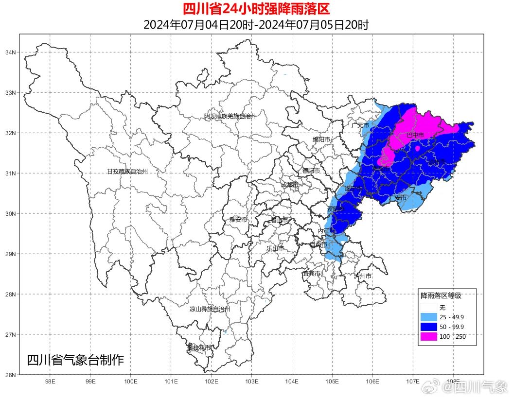 7月4日20时到5日20时:盆地大部有雷雨或阵雨,雷雨时伴有短时阵性大风,其中巴中、南充、达州3市和广元、遂宁、资阳、内江4市东部以及广安西部有暴雨(雨量50-90毫米),其中,巴中、南充北部和达州北部有大暴雨(150-200毫米),最大小时雨量40-60毫米。