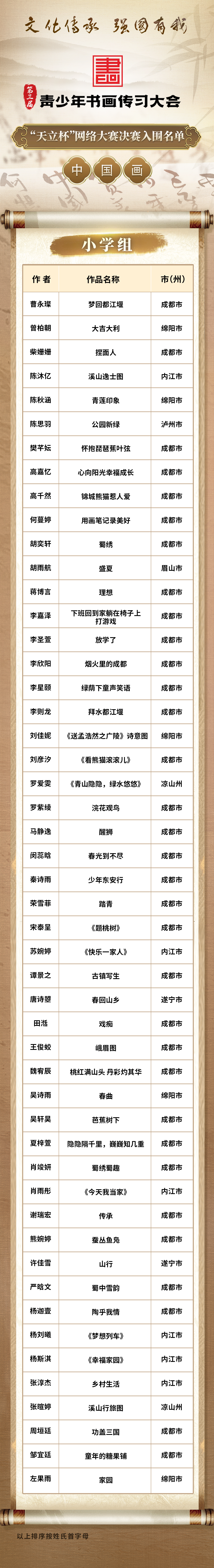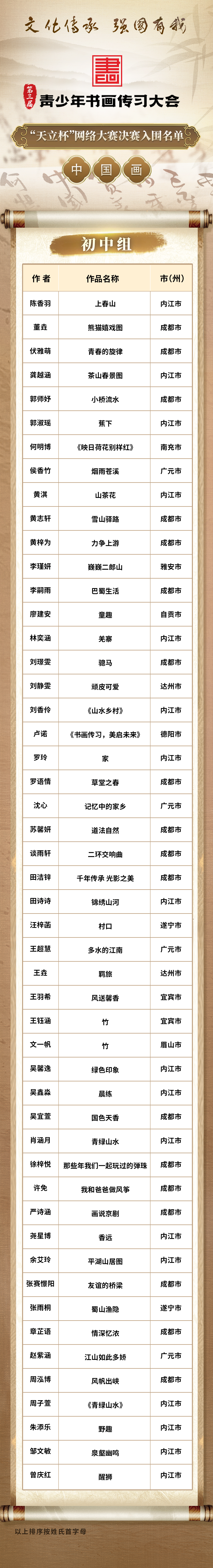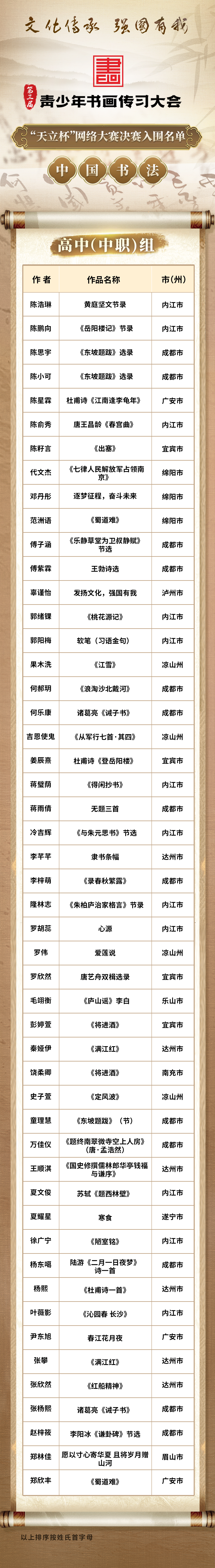 四川发布客户端消息 今日,第三届青少年书画传习大会“天立杯”网络大赛线下评审结果正式出炉,共计281份作品入围网络大赛决赛。选手名单来了!