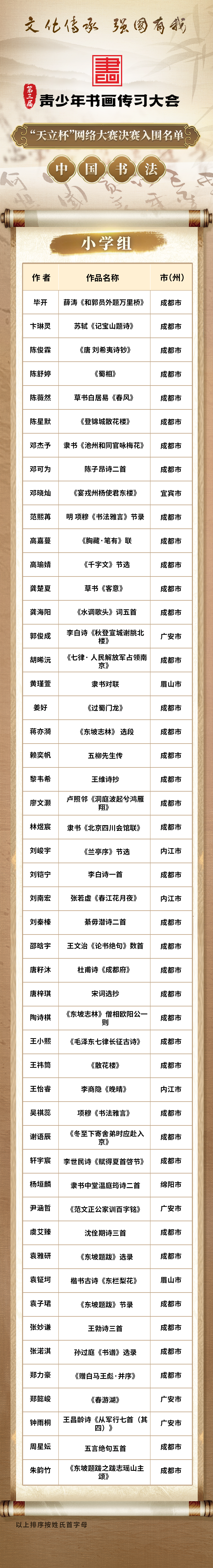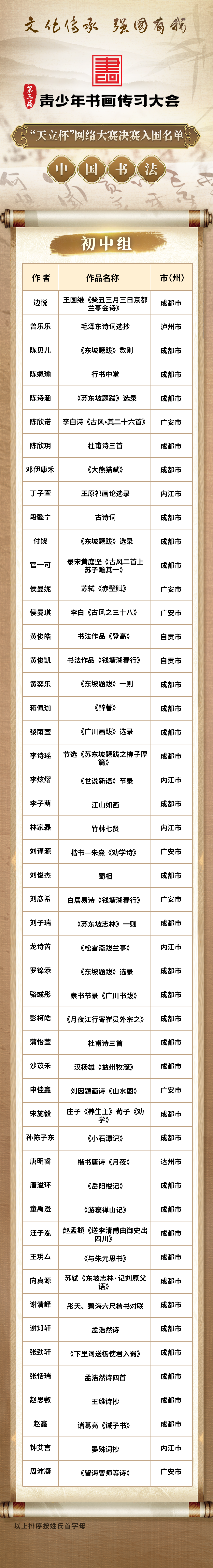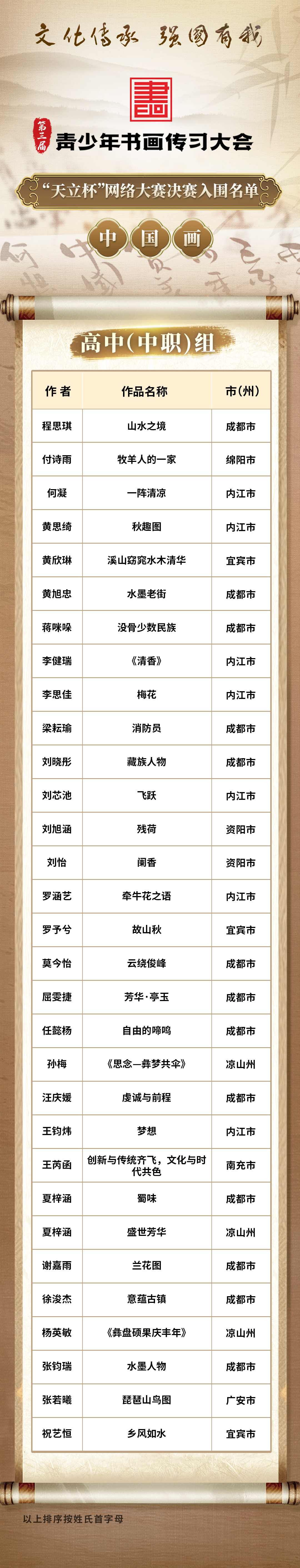 四川发布客户端消息 今日,第三届青少年书画传习大会“天立杯”网络大赛线下评审结果正式出炉,共计281份作品入围网络大赛决赛。选手名单来了!